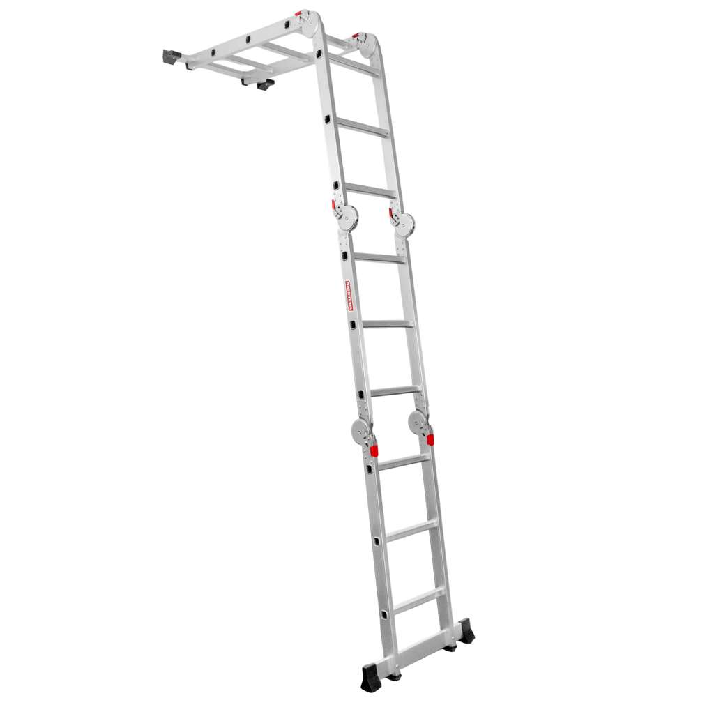 Drabina składana została wykonana z lekkiego, a zarazem trwałego aluminium, dzięki czemu gwarantuje stabilność, odporność na korozję i długą żywotność. Dzięki przemyślanej budowie i solidnym przegubom blokującym drabinę można w prosty sposób modyfikować, dostosowując ją do różnych zadań i wysokości roboczych – od klasycznej drabiny wolnostojącej po drabinę przystawną. W zestawie znajduje się podest roboczy, który po zamontowaniu pełni funkcję praktycznego rusztowania. Rozwiązanie to zwiększa wygodę i bezpieczeństwo pracy, zwłaszcza przy czynnościach wymagających czasu, precyzji i stabilnego podłoża.