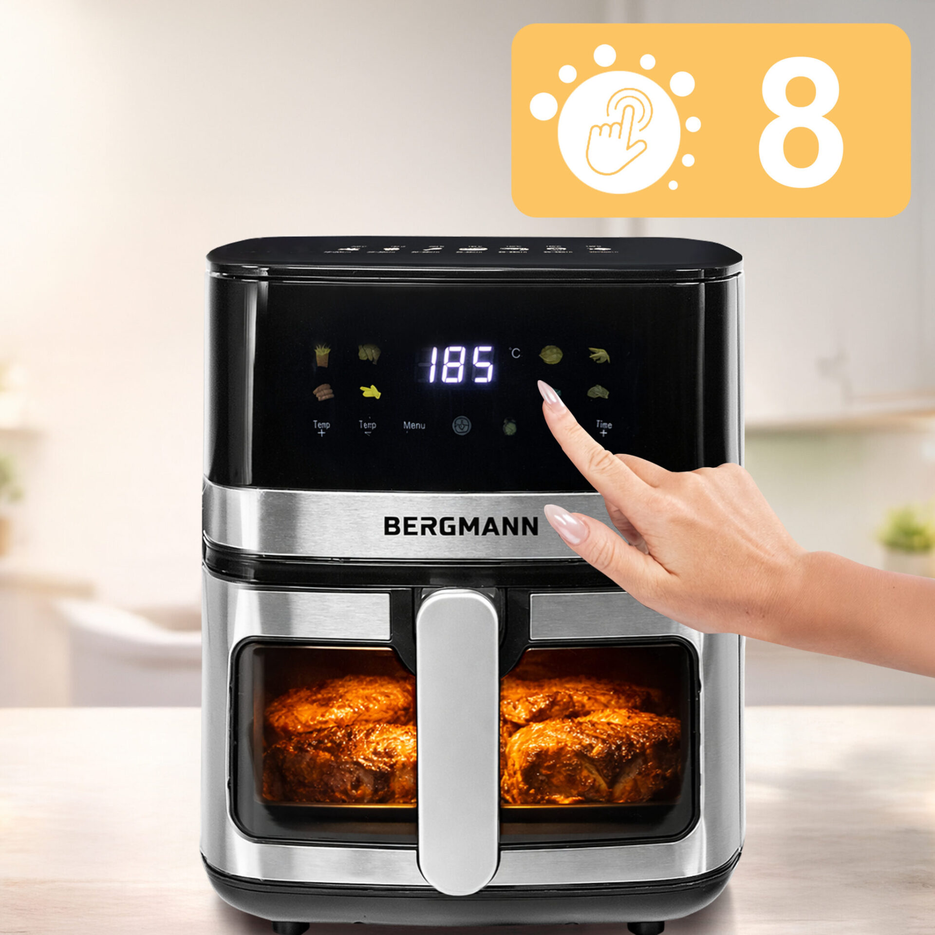 Dzięki 8 automatycznym programom gotowanie staje się intuicyjne – wystarczy jeden dotyk panelu LED, by frytkownica zajęła się resztą. Wbudowane okienko z oświetleniem pozwala na bieżąco kontrolować proces przygotowywania pożywienia, a kosz z powłoką nieprzywierającą oraz tacka nadająca się do zmywarki gwarantują łatwe czyszczenie. To urządzenie, które oszczędza czas, dba o zdrowie i sprawia, że codzienne sporządzanie posiłków staje się czystą przyjemnością.