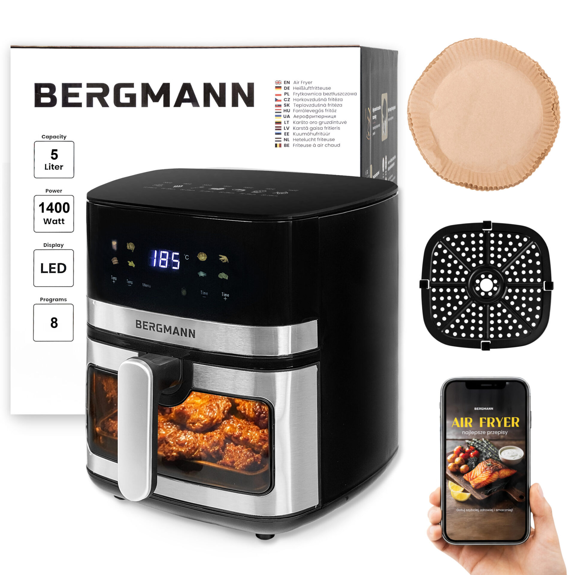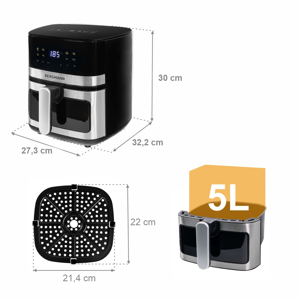 Air Fryer BERGMANN YA o pojemności 5L to nie tylko frytkownica, ale sprytne rozwiązanie, które łączy w sobie funkcjonalność kilku urządzeń. Dzięki technologii szybkiej cyrkulacji gorącego powietrza przygotujesz ulubione dania w zdrowszej odsłonie – chrupiące frytki bez kropli oleju, soczyste mięso o złocistej skórce czy aromatyczne warzywa pełne smaku. Pojemność 5 litrów sprawia, że to idealny wybór dla singli, par i małych rodzin, a kompaktowa konstrukcja nie zajmuje dużo miejsca w kuchni.