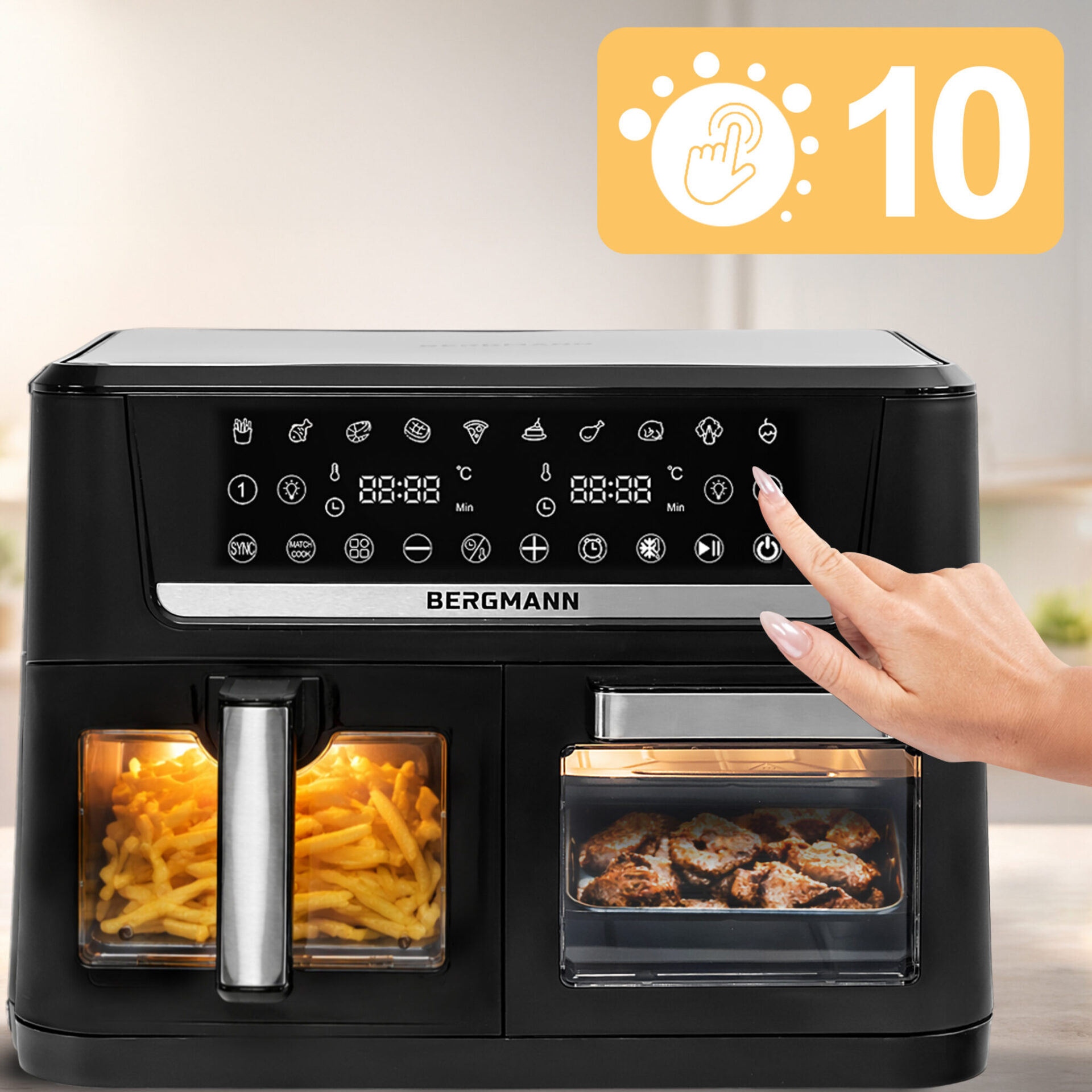 Frytkownica beztłuszczowa Air Fryer BERGMANN YO dwa kosze 6L+8L o mocy 2800W – z kuchenną rękawicą w zestawie
