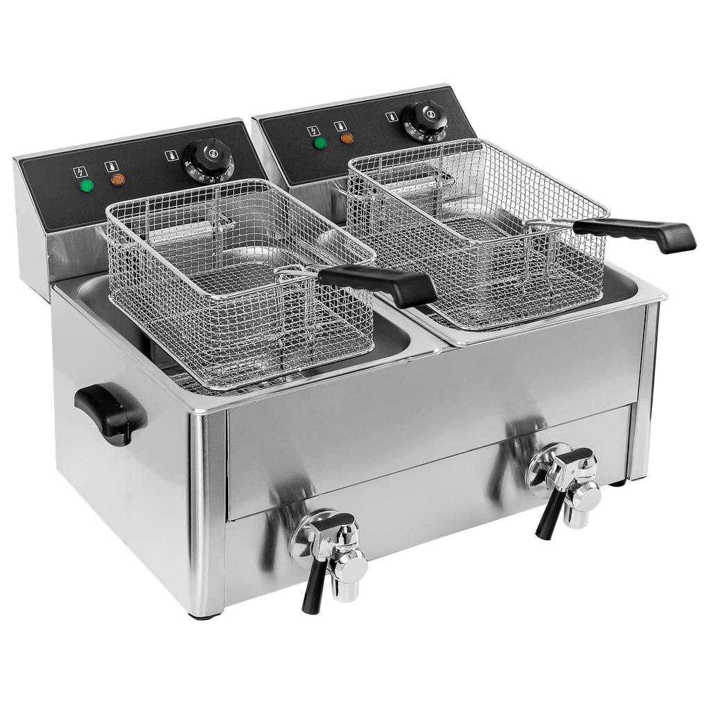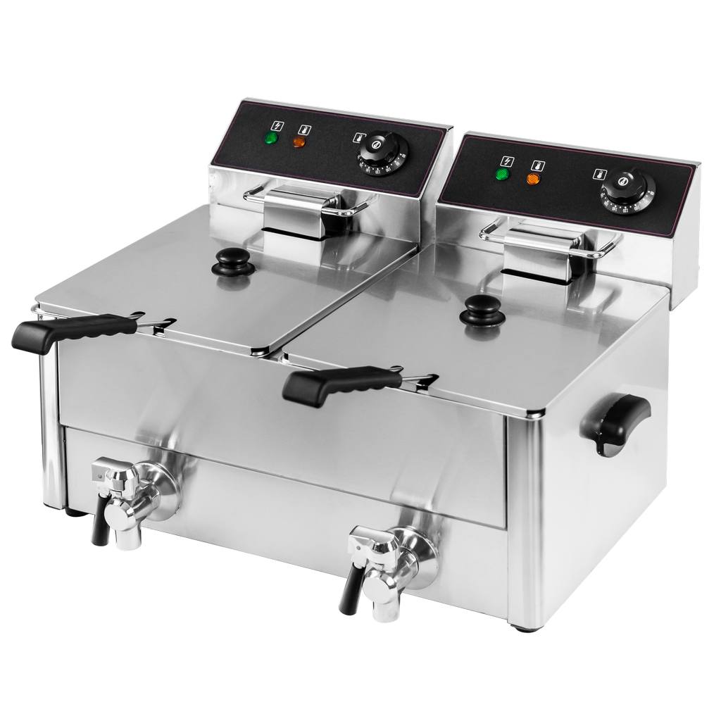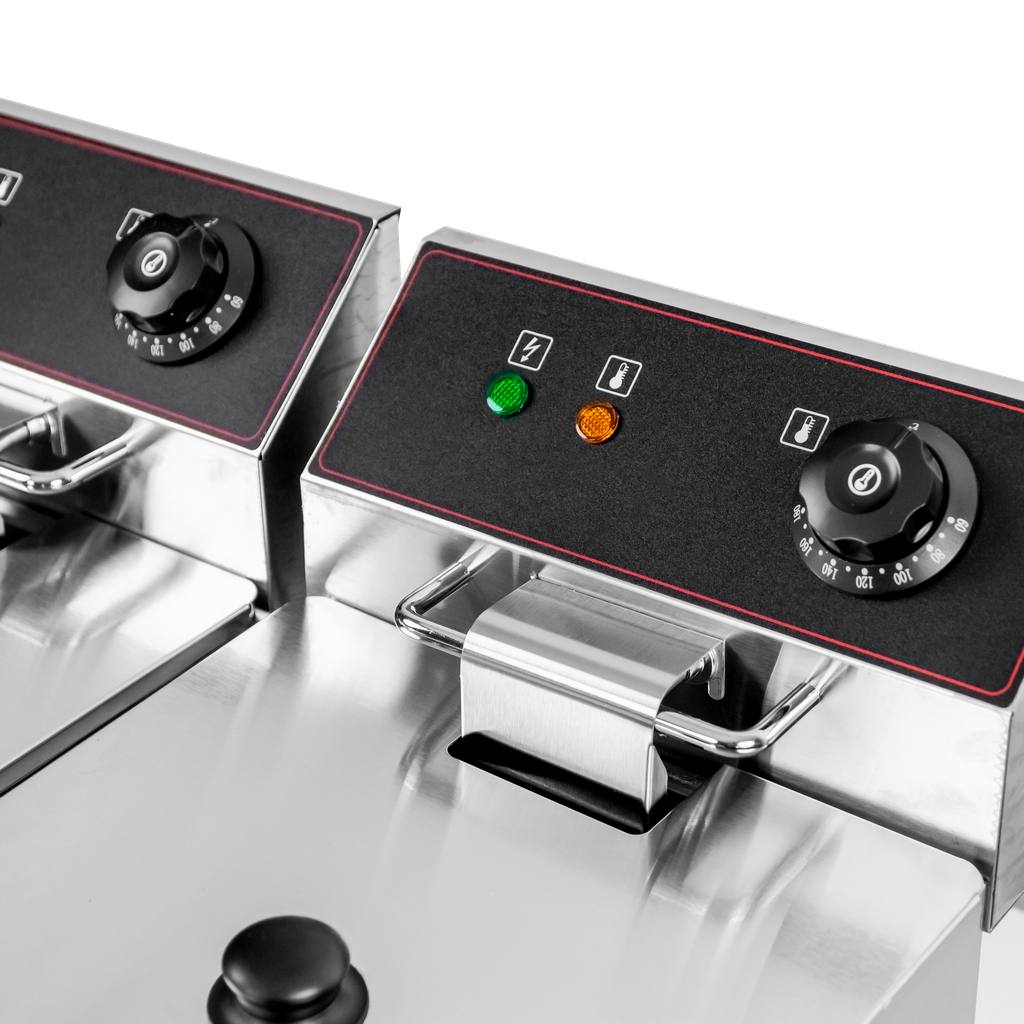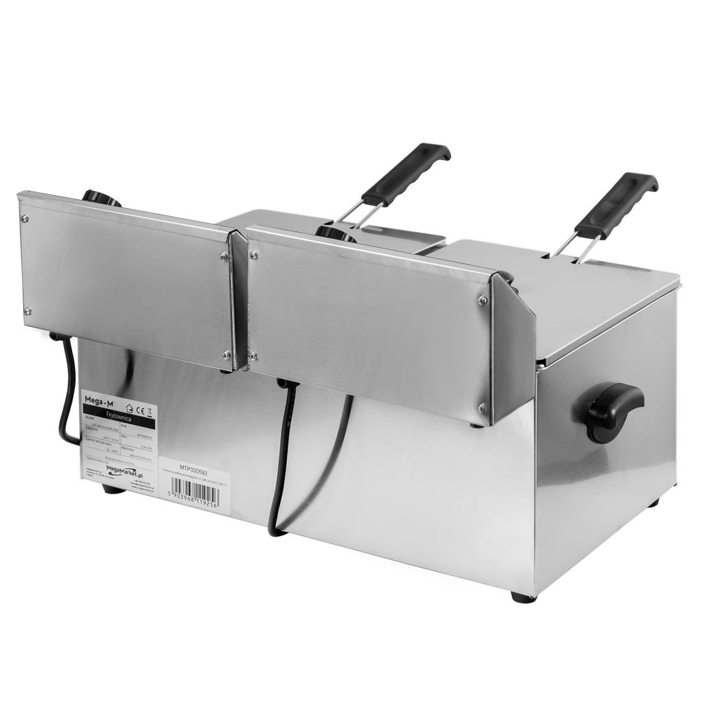 Dwukomorowa frytkownica o pojemności 2x6L. Doskonale sprawdzi się do smażenia mięs, frytek, a nawet różnego rodzaju warzyw. Frytkownice marki Mega-M to gwarancja bezawaryjności. Solidna konstrukcja zapewni długi okres użytkowania. Zdejmowany element grzewczy umożliwia staranne wyczyszczenie zbiorników na olej. Komory oraz obudowa zostały wykonane z odpornej na wysoką temperaturę oraz uszkodzenia mechaniczne stali nierdzewnej. Urządzenie nie wchodzi w reakcje z przygotowywaną żywnością. Dwukomorowa frytkownica znajdzie zastosowanie w domach weselnych, restauracjach oraz barach szybkiej obsługi.