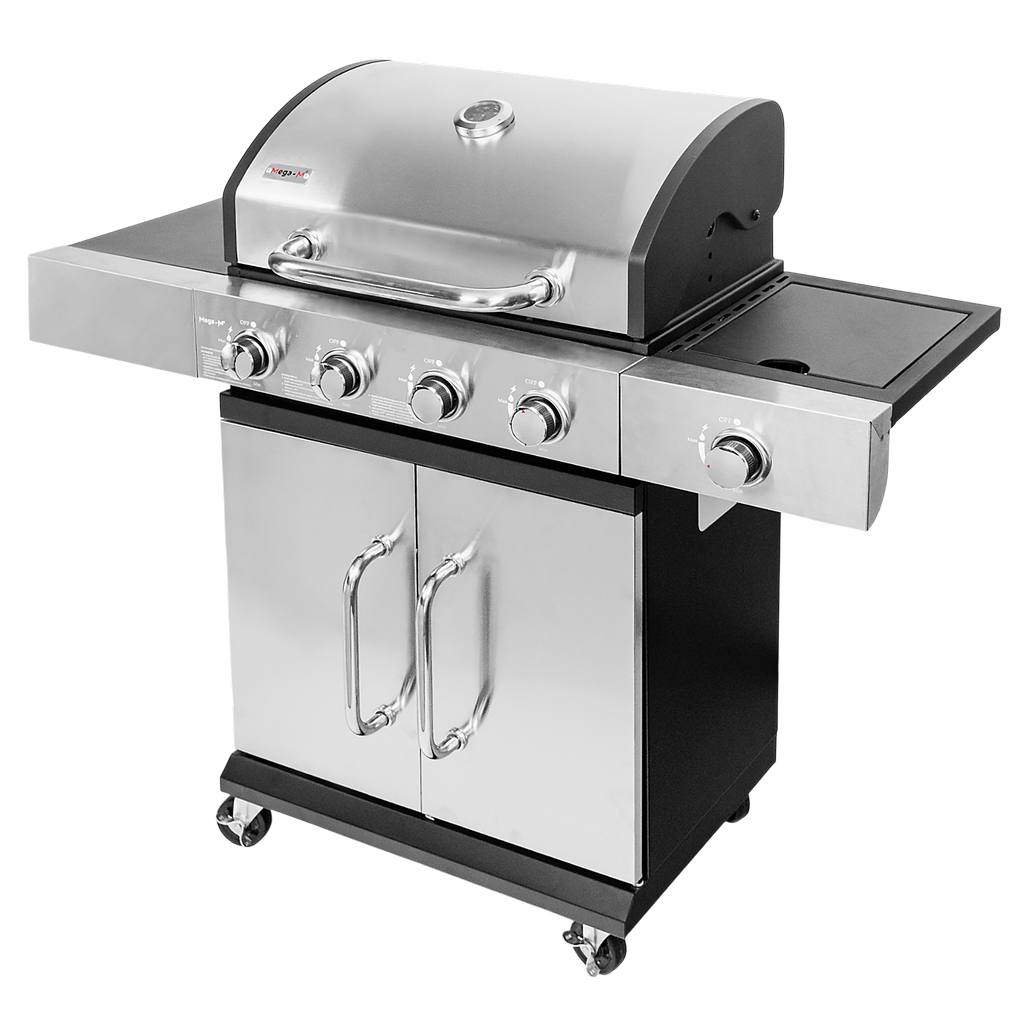 Grill gazowy Mega-M 4+1 z pokrywą i drzwiczkami ze stali nierdzewnej to wysokiej klasy urządzenie, które łączy nowoczesny design z maksymalną funkcjonalnością. Wyposażony w cztery niezależne palniki główne oraz dodatkowy palnik boczny, grill ten pozwala na jednoczesne przygotowanie różnych potraw. Solidna konstrukcja, przemyślane detale i estetyczne wykończenie sprawiają, że grill ten to nie tylko sprzęt do gotowania, ale także element, który podnosi prestiż każdej przestrzeni ogrodowej czy gastronomicznej. Grill posiada wymiary 120x48x110 cm, co gwarantuje dużą powierzchnię roboczą. Pokrywa i frontowe drzwiczki wykonane ze stali nierdzewnej – odpornej na korozję, warunki atmosferyczne i intensywne użytkowanie. Zastosowanie bocznych ścianek oraz zaworu redukcyjnego zapewni bezpieczeństwo użytkowania, a cztery kółka (dwa z blokadą) umożliwiają łatwe przemieszczanie urządzenia w wybrane miejsce.