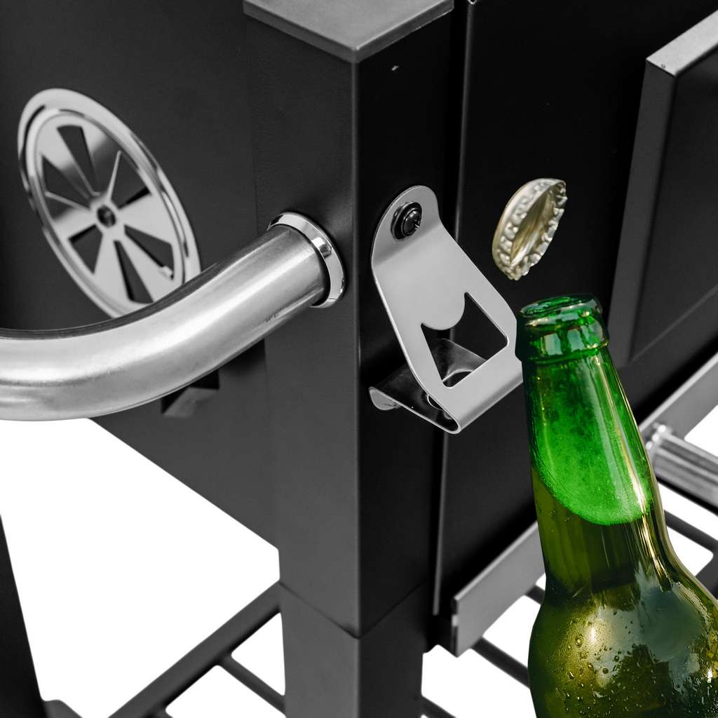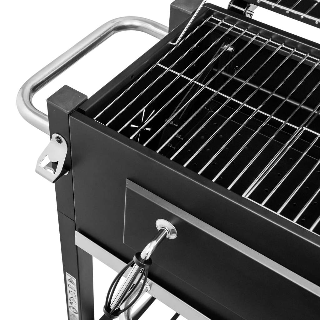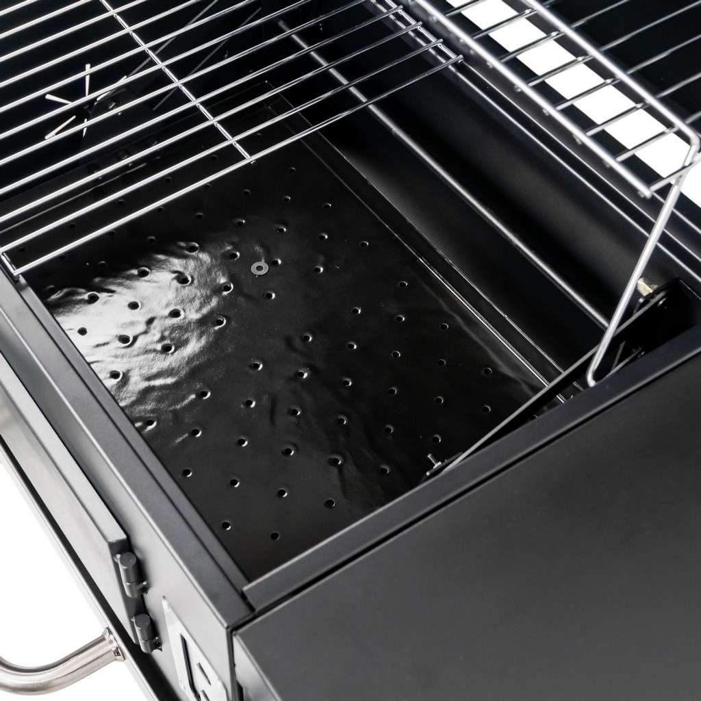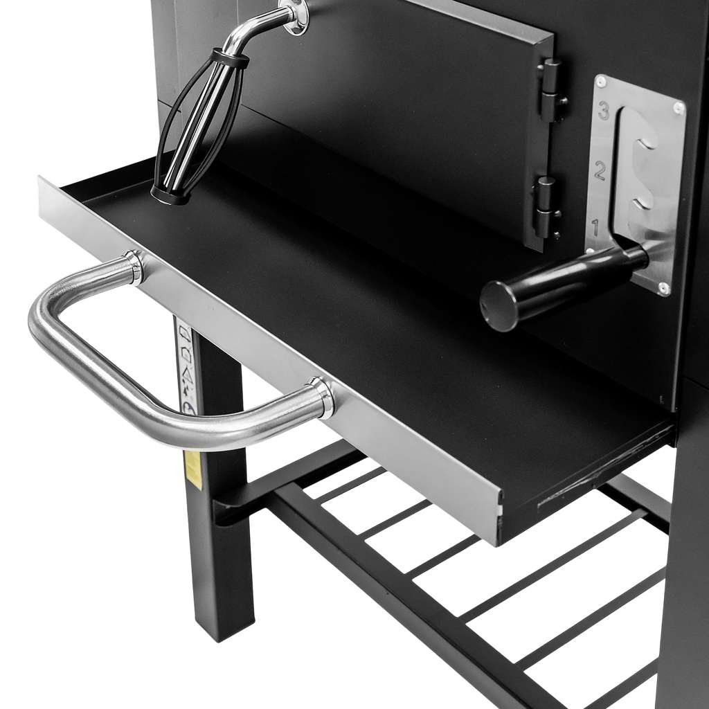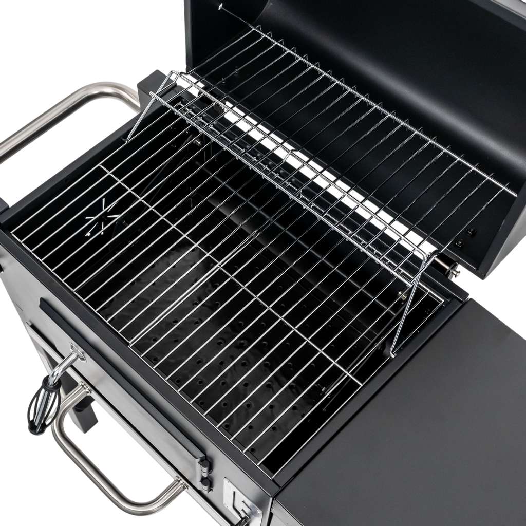 Grill węglowy Mega-M  to doskonały wybór dla miłośników grillowania w przydomowym ogrodzie. Jego solidna misa paleniskowa, wykonana ze stali malowanej odpornej na wysokie temperatury, gwarantuje trwałość i niezawodność przez wiele sezonów. Wyposażony w chromowany ruszt do grillowania oraz podgrzewania potraw, grill oferuje wszechstronność przygotowywania posiłków. Dzięki otwieranej klapie w misie, uzupełnianie węgla drzewnego jest szybkie i wygodne. Mobilna konstrukcja wózka,  półka boczna oraz dodatkowe udogodnienia, takie jak szuflada na popiół, regulacja wysokości paleniska czy termometr w pokrywie, zapewniają komfort użytkowania, sprawiając, że grillowanie staje się czystą przyjemnością.