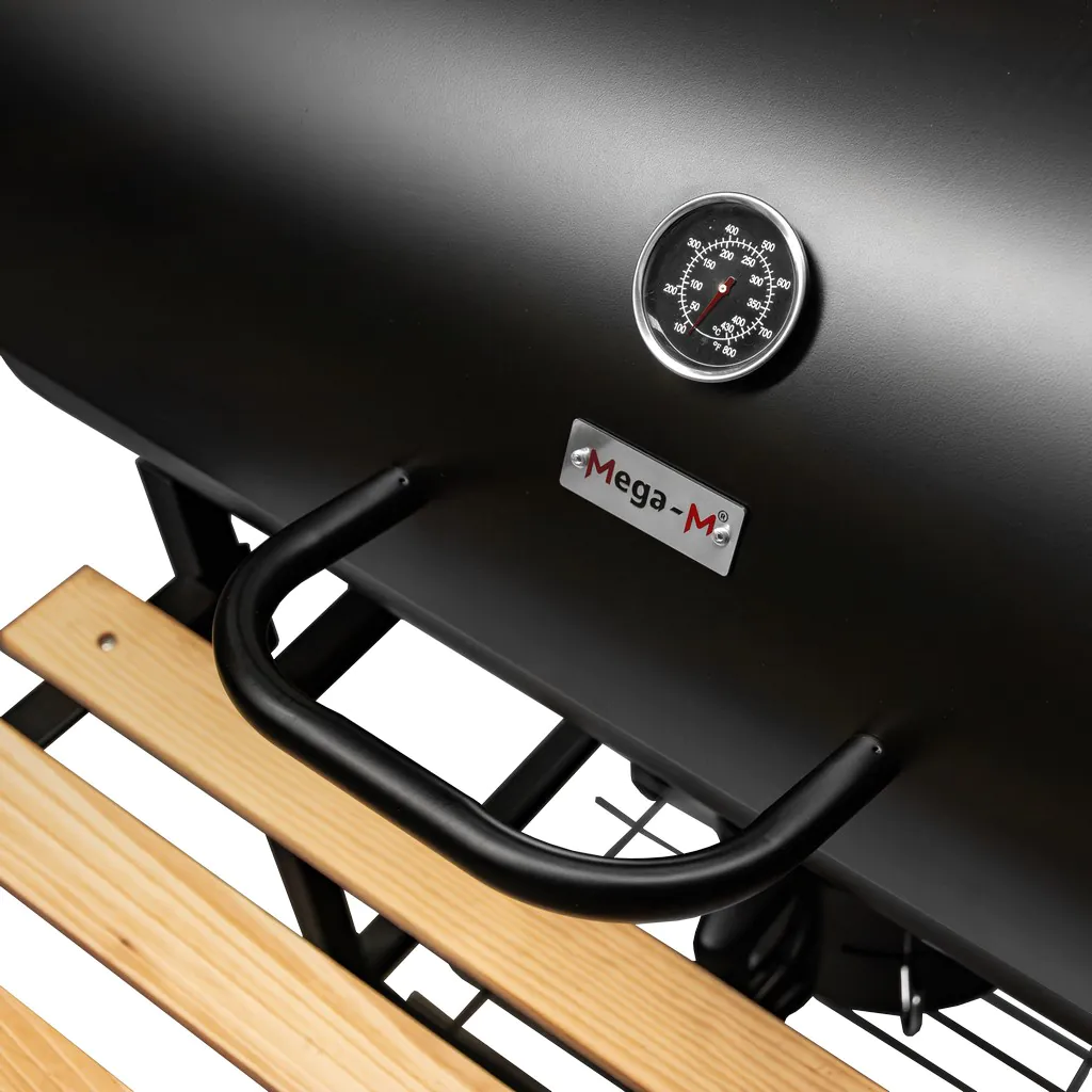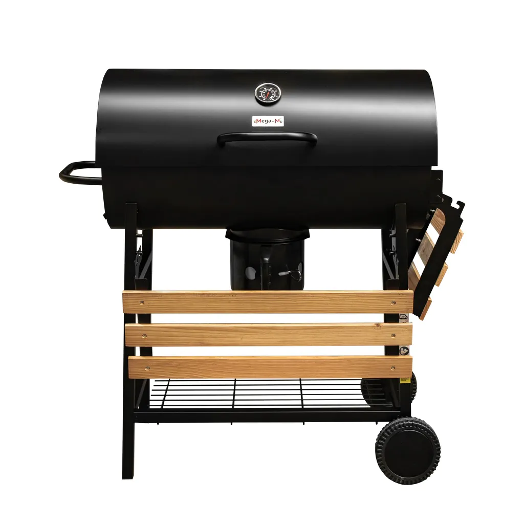 Grill węglowy Mega-M to jeden z najbardziej popularnych rodzajów grilla. Wózek cechuje solidna i trwała, mobilna konstrukcja oraz rozwiązania, które gwarantują wygodę użytkowania. Grill beczkowy wyposażony jest w dwie składane półki, które zapewniają miejsce do przygotowania przekąsek. Misa paleniskowa wykonana jest ze stali malowanej odpornej na działanie wysokiej temperatury. Urządzenie wyposażone jest w chromowany ruszt do grillowania i podgrzewania potraw. Wbudowany termometr w pokrywie umożliwia kontrolę temperatury, bez potrzeby otwierania grilla.