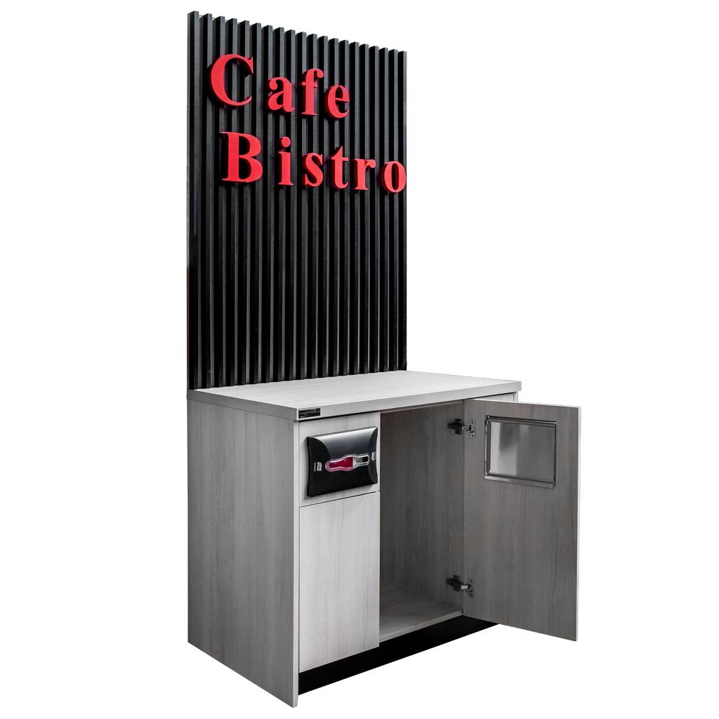 Kącik kawowy Mega-M zapewni specjalną przestrzeń do komfortowego parzenia kawy. Wyróżnia się niezwykłą elegancją, funkcjonalnością i solidnym wykonaniem. Szafka pod ekspres do kawy posiada 2 podajniki na kubki, podajnik na serwetki oraz miejsce na kosz z nierdzewną klapką. To wszystko ułatwia zachowanie porządku w miejscu przyrządzania kawy. Stoisko kawowe spełnia funkcję nie tylko praktyczną ale i dekoracyjną. Nadaje szczególny klimat pomieszczeniu, w którym się znajduje.