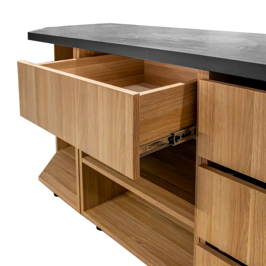 Lada sprzedażowa Mega-M cechuje się niezwykłą solidnością. Wykonana została z wytrzymałej płyty meblowej z dbałością o najdrobniejsze szczegóły. Nie tylko ładnie się prezentuje ale jest również niezwykle praktyczna. Dzięki licznym półkom i szufladom pomieści wszystkie potrzebne dokumenty. Lada wpłynie pozytywnie na wizerunek każdego lokalu oraz wywoła odpowiednie wrażenia na klientach. Idealnie sprawdzi się na stacjach benzynowych, w restauracjach, pizzeriach, kawiarniach czy sklepach spożywczo-przemysłowych. Pomoże zaaranżować przestrzeń recepcji, punktu handlowego czy usługowego.