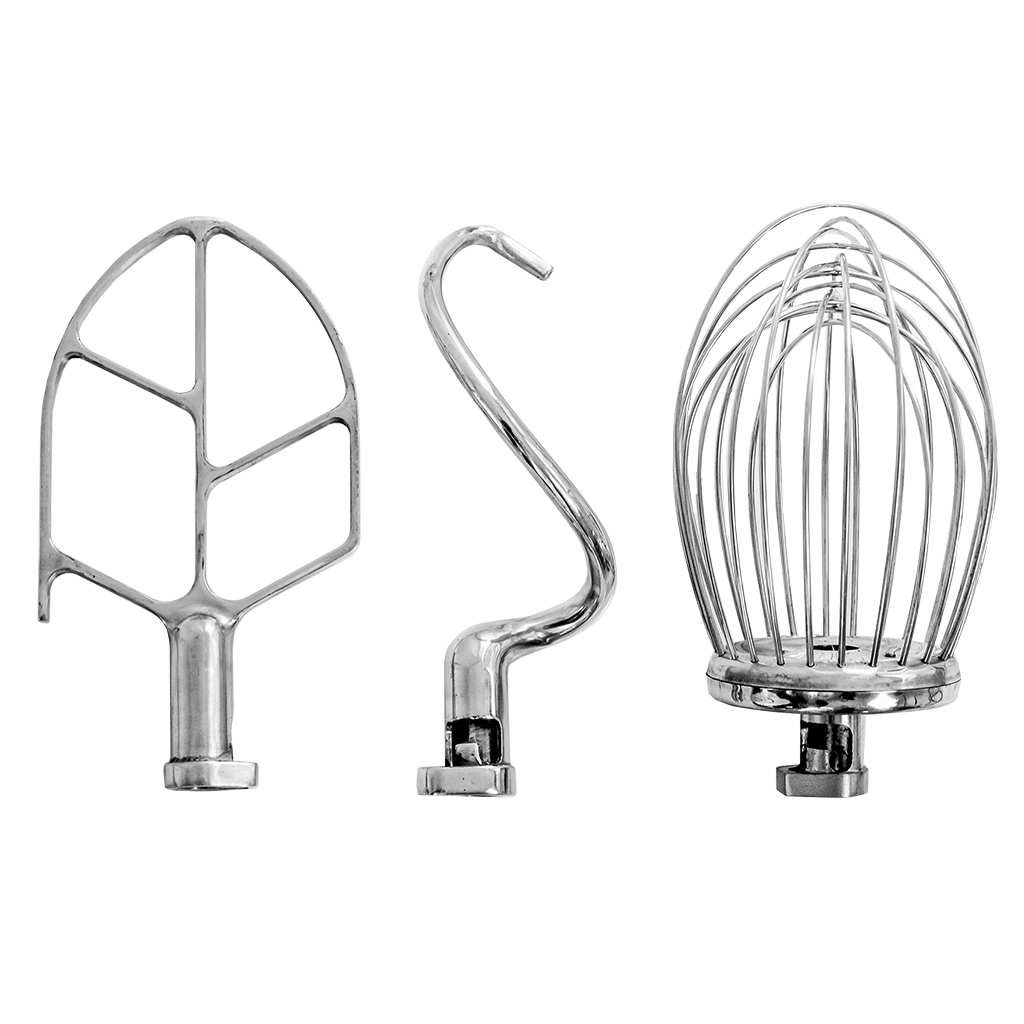 Trzepaczka ze stali nierdzewnej do mikserów planetarnych do mieszania produktów o małej gęstości Mieszadło płaskie ze stali nierdzewnej do mikserów planetarnych gastronomicznych Mega-M do mieszania produktów zbitych Hak do ciasta ze stali nierdzewnej do mikserów planetarnych Mega-M do mieszania produktów o dużej gęstości