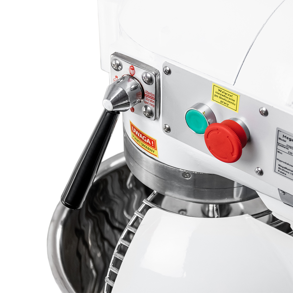 Mikser planetarny marki Mega-M charakteryzuje się wysoką wydajnością, wygodną obsługą i profesjonalnym wyglądem. Służy do miksowania produktów gastronomicznych zarówno o lekkiej jak i ciężkiej konsystencji, ubijania piany czy mieszania farszu. Przystosowany jest do usprawnienia etapów przygotowywania potraw i wyrobów cukierniczych: kremów, sosów, ciast, bitej śmietany do 12 kg. Wykonuje swoją pracę dokładnie i szybko, pozwalając oszczędzić czas.