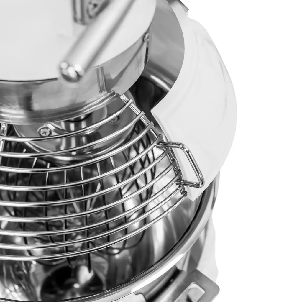 Mikser wyposażony jest w trzy mieszadła – hak, trzepaczkę i ubijaczkę – które pozwalają na różnorodne zastosowania, od wyrabiania ciasta po ubijanie lekkich pianek. Wbudowany timer, zabezpieczenie przed przeciążeniem, awaryjne zatrzymanie oraz osłona bezpieczeństwa zwiększają komfort i bezpieczeństwo użytkowania. Solidna metalowa konstrukcja gwarantuje trwałość, a kompaktowe wymiary (35×45×66 cm) pozwalają na wygodne użytkowanie nawet w mniejszych przestrzeniach.