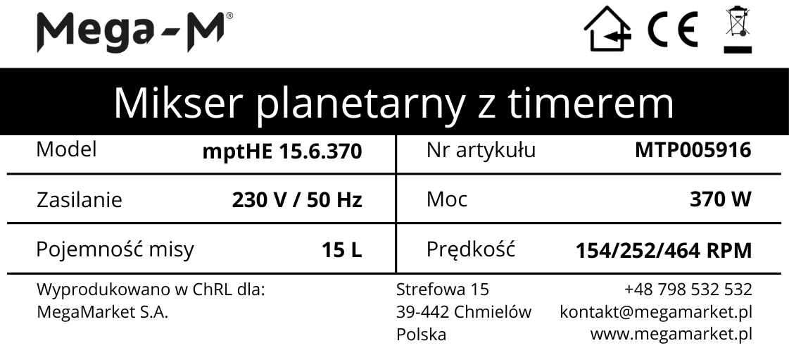 Mikser planetarny z timerem Mega-M mptHE 15.6.370 N