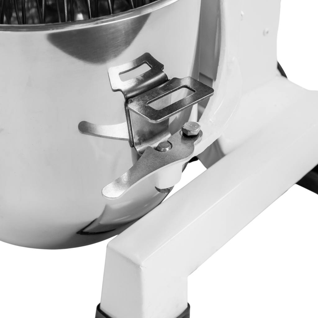 Mikser wyposażony jest w hak, trzepaczkę i ubijaczkę, które pozwalają na wszechstronne zastosowanie w cukiernictwie, piekarstwie i kuchniach profesjonalnych. Dodatkowe funkcje, takie jak timer, zabezpieczenie przed przeciążeniem, awaryjne zatrzymanie i mikrowyłącznik, zwiększają komfort i bezpieczeństwo użytkowania. Dzięki osłonie ochronnej operator ma pełną kontrolę nad procesem mieszania, a metalowa konstrukcja zapewnia trwałość i odporność na intensywną eksploatację.