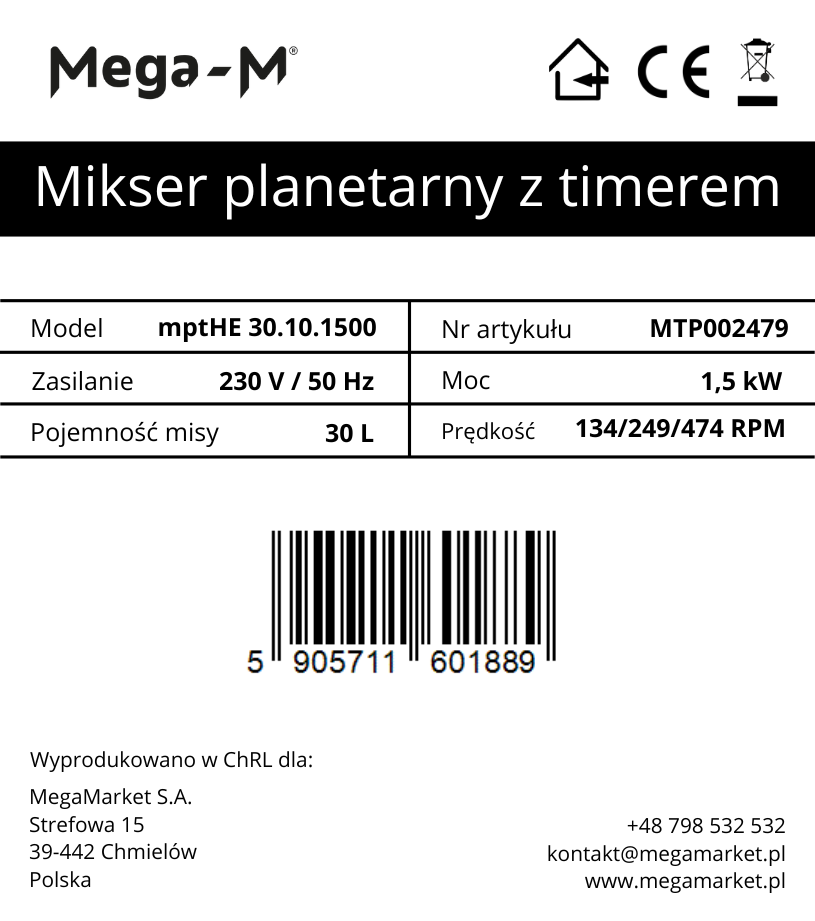 Mikser planetarny z timerem Mega-M mptHE 30.10.1500 N