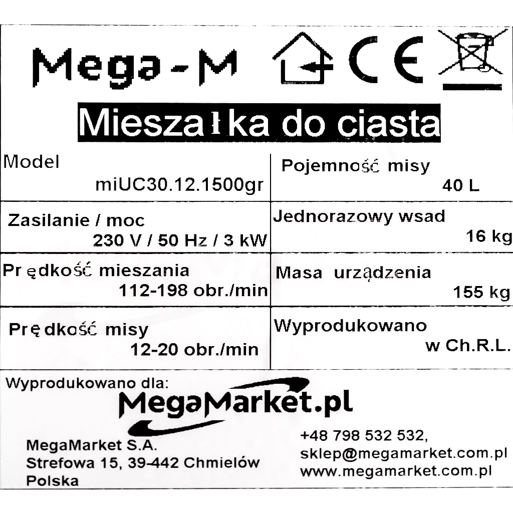 Parametry miksera spiralnego Mega-M:
