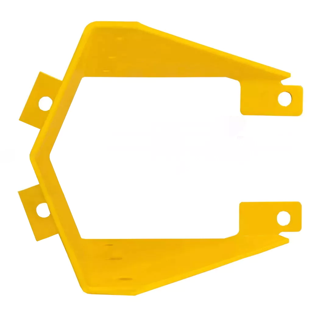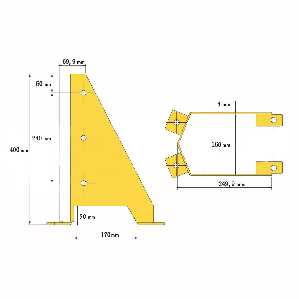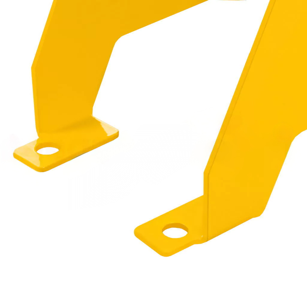 Odbój nogi regału magazynowego Mega-M wykonany został ze stali lakierowanej na kolor żółty. Posiada 4 otwory do zamontowania na stałe w posadzce oraz boczne otwory do przykręcenia m. in. belki poziomej. Odbój zapewnia większe bezpieczeństwo poruszania się wózkami widłowymi po terenie magazynu, co zmniejsza ryzyko poważnych napraw regałów.