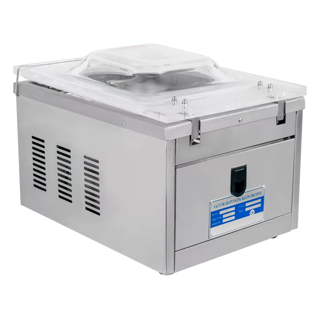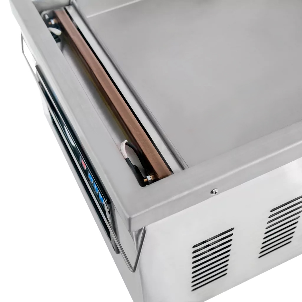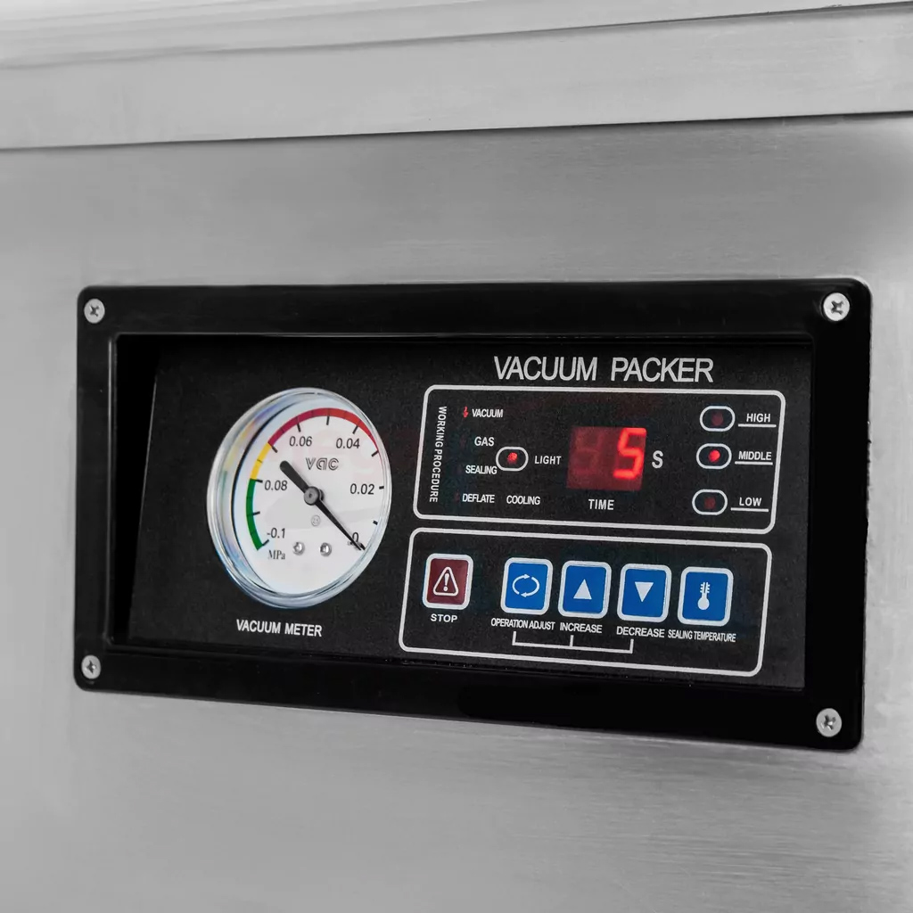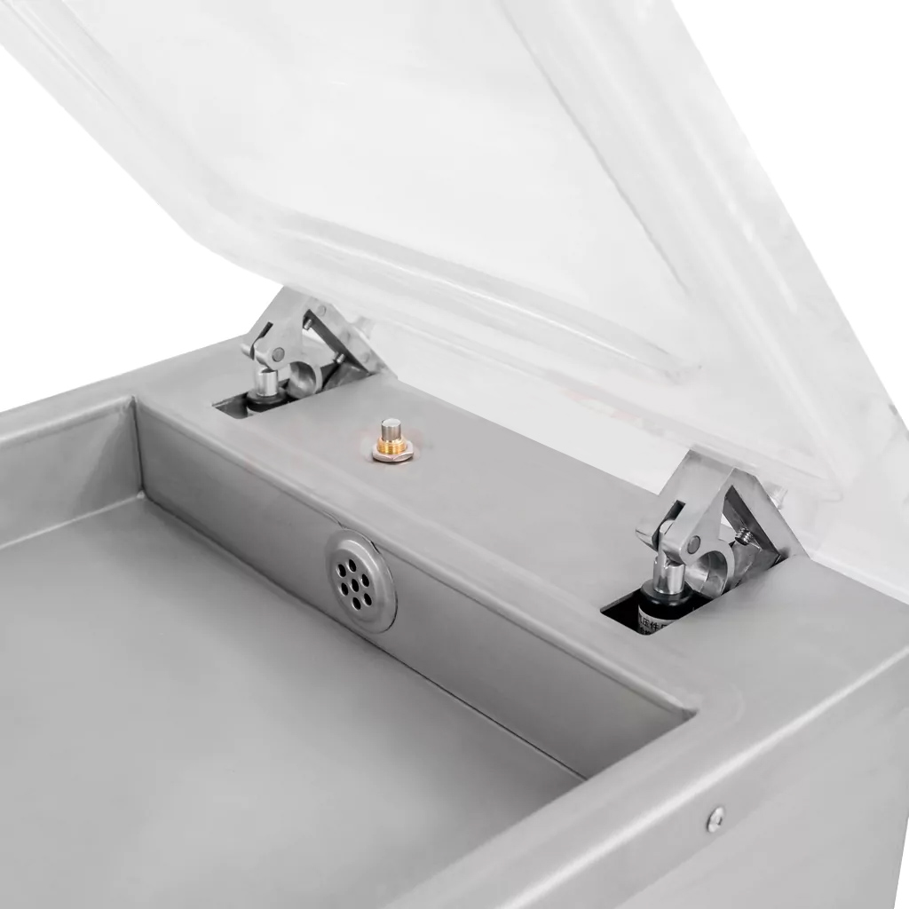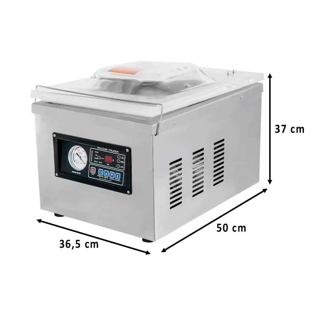 Urządzenie wykonane jest ze stali nierdzewnej. Posiada higieniczną komorę z poliwęglanu z zaokrąglonymi narożnikami ułatwiającą utrzymanie czystości. Przycisk STOP umożliwiający awaryjne przerwanie procesu pakowania oraz manometr (wskaźnik ciśnienia), pozwalający na kontrolę próżni.