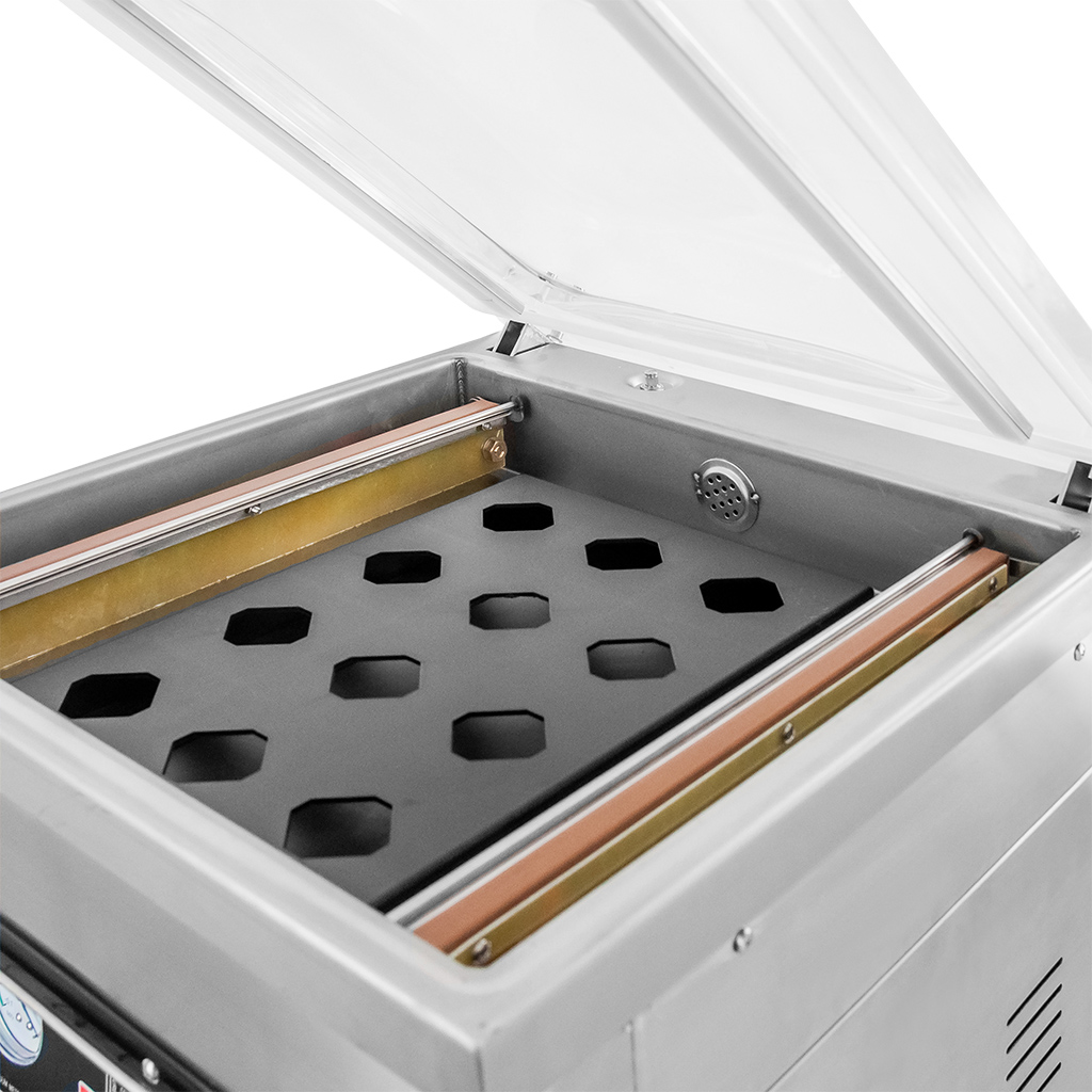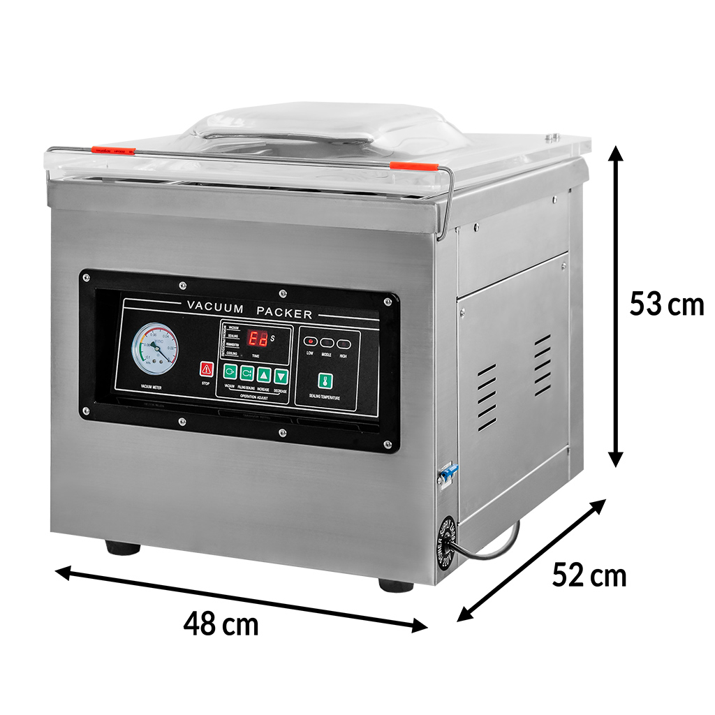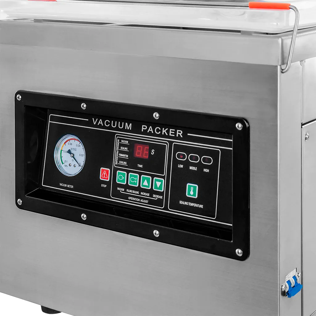 Urządzenie wykonane jest ze stali nierdzewnej. Posiada higieniczną komorę z poliwęglanu z zaokrąglonymi narożnikami ułatwiającą utrzymanie czystości. Przycisk STOP umożliwiający awaryjne przerwanie procesu pakowania oraz manometr (wskaźnik ciśnienia), pozwalający na kontrolę próżni.