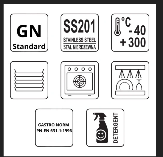 Pojemniki GN są w pełni zgodne z normą GASTRO NORM PN-EN 631-1:1996, co oznacza, że ich wymiary są standaryzowane i kompatybilne z systemami GN, stosowanymi w branży gastronomicznej: