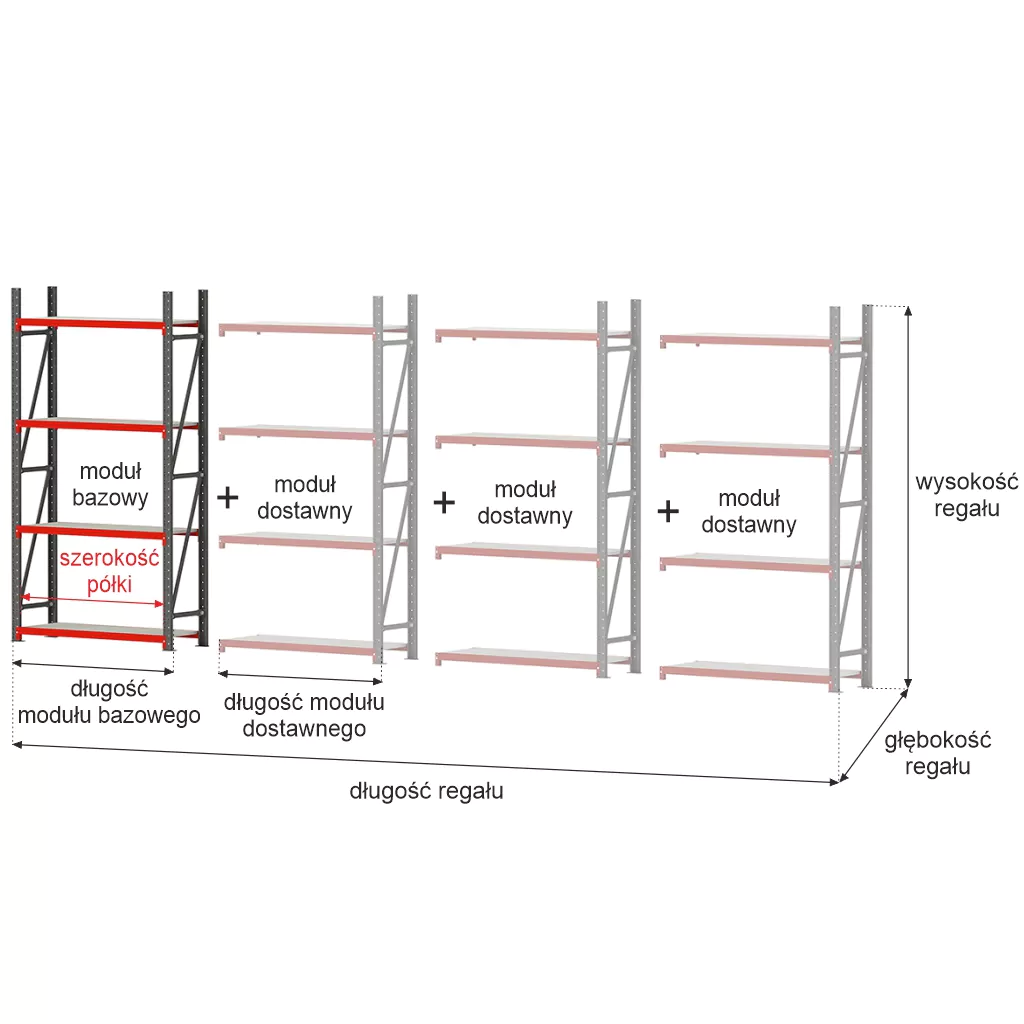 Do modułu dostawnego konieczne jest dokupienie modułu bazowego, aby regał był w pełni funkcjonalny i nadawał się do użytkowania.