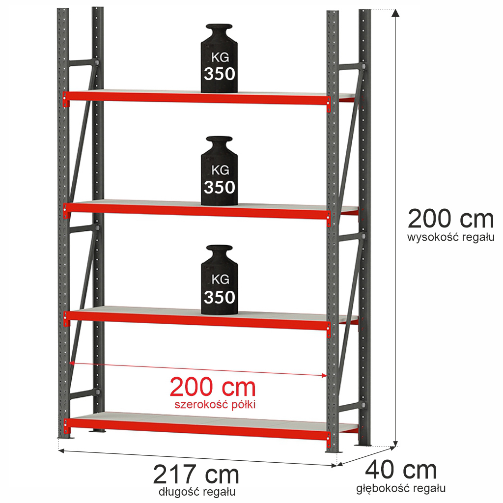 Regał magazynowy 4-półkowy Mega-M FORTIS H-200 cm L-217 cm G-40 cm moduł bazowy N