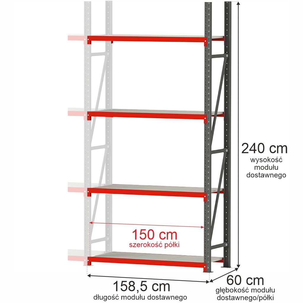 Regał modułowe marki Mega-M FORTIS o wysokości 240 cm, długości 158,5 cm, głębokości 60 cm i wymiarach półek 150×60 cm. Maksymalne obciążenie na półkę 450 kg przy równomiernie rozłożonym obciążeniu.