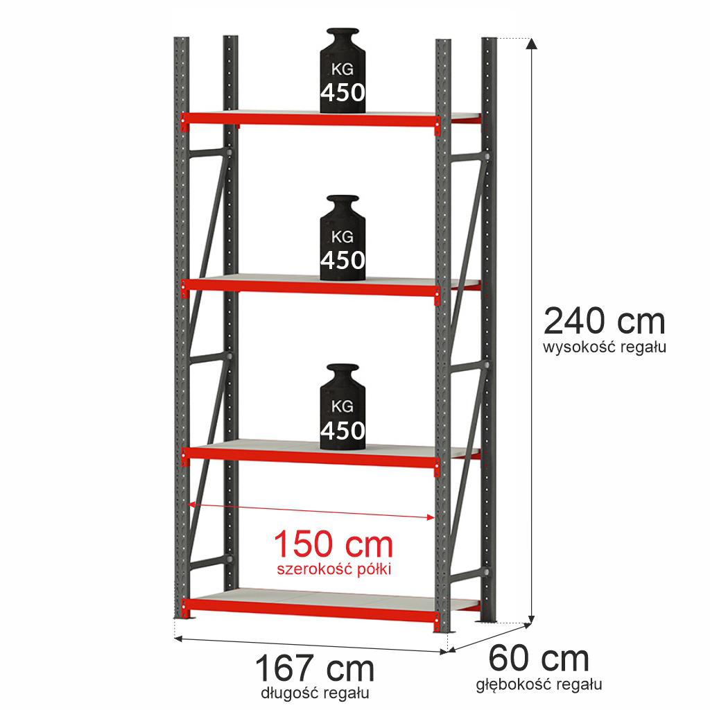 Maksymalne obciążenie na półkę 450 kg przy równomiernie rozłożonym obciążeniu.