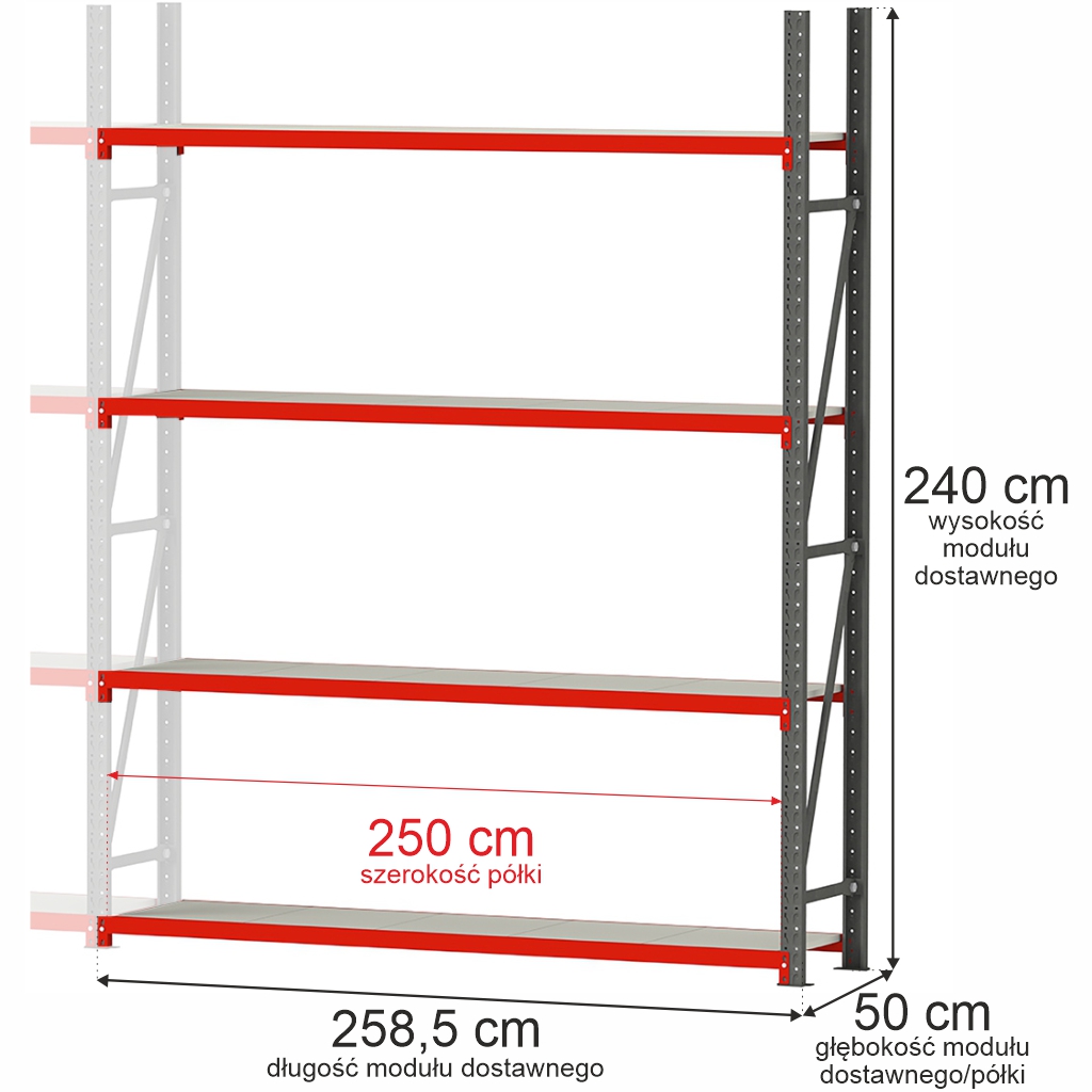 Regał magazynowy 4-półkowy Mega-M FORTIS H-240 cm L-258,5 cm G-50 cm moduł dostawny N