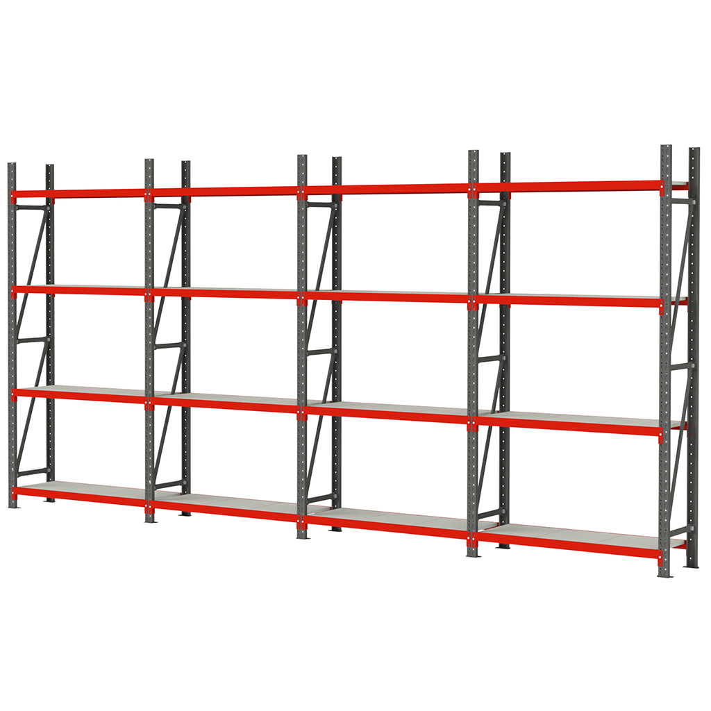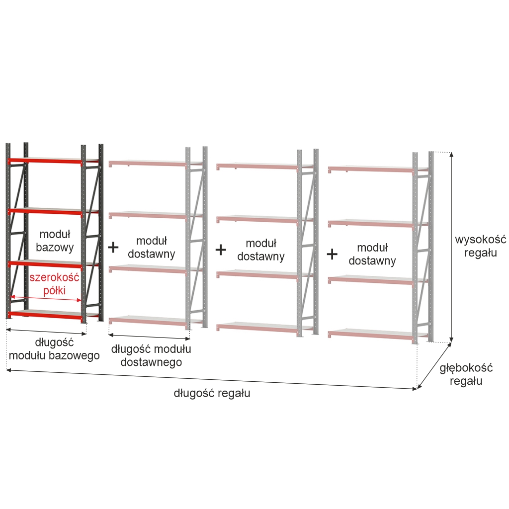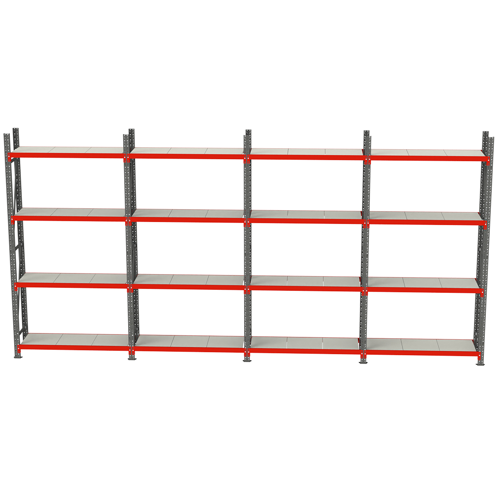 Regał magazynowy 4-półkowy Mega-M FORTIS H-240 cm L-642,50 cm G-50 cm zestaw ( 4 moduły x 150 cm) N