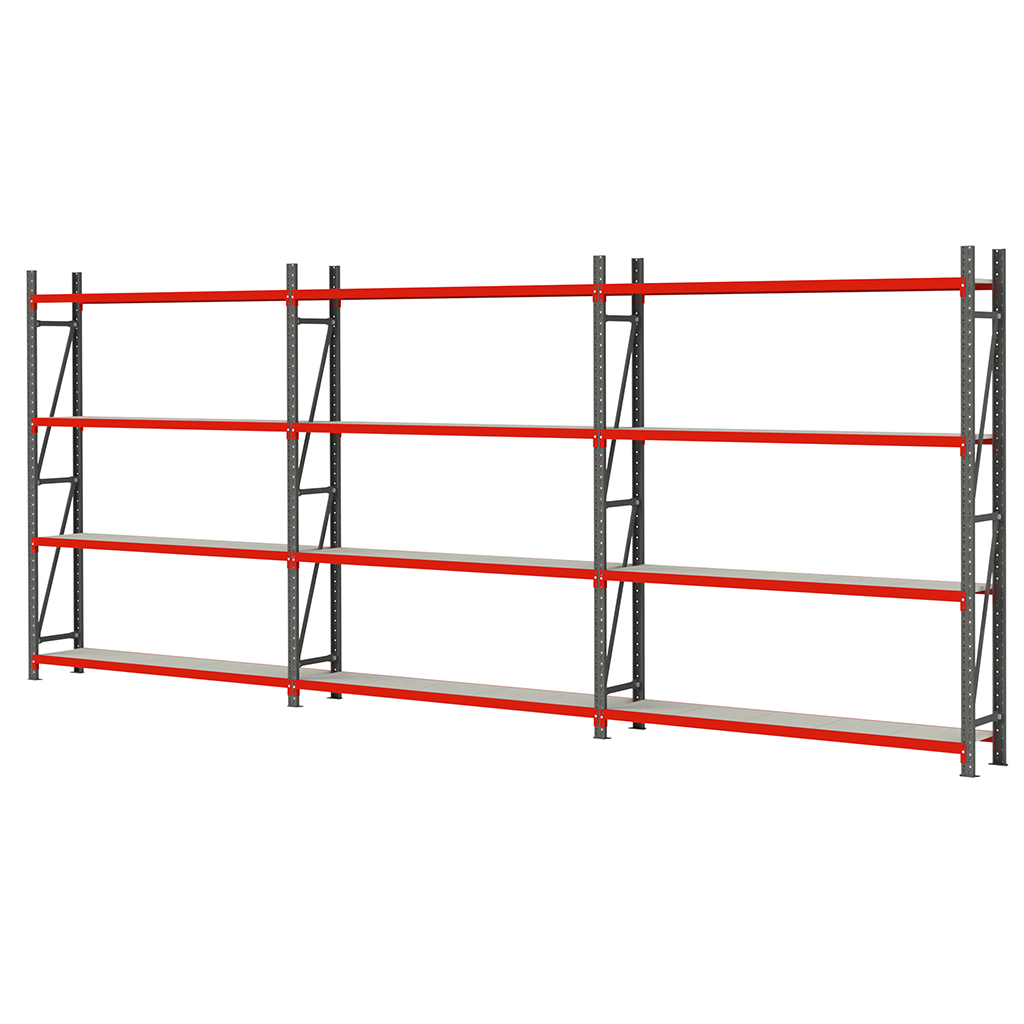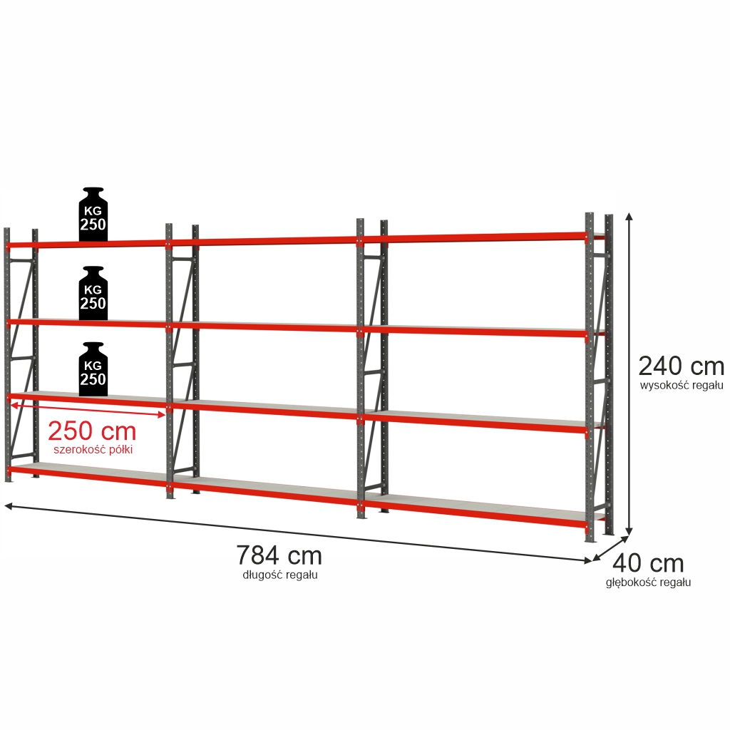 Regał magazynowy 4-półkowy Mega-M FORTIS H-240 cm L-784 cm G-40 cm zestaw ( 3 moduły x 250 cm) N