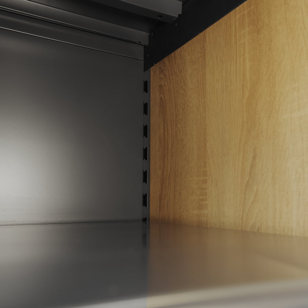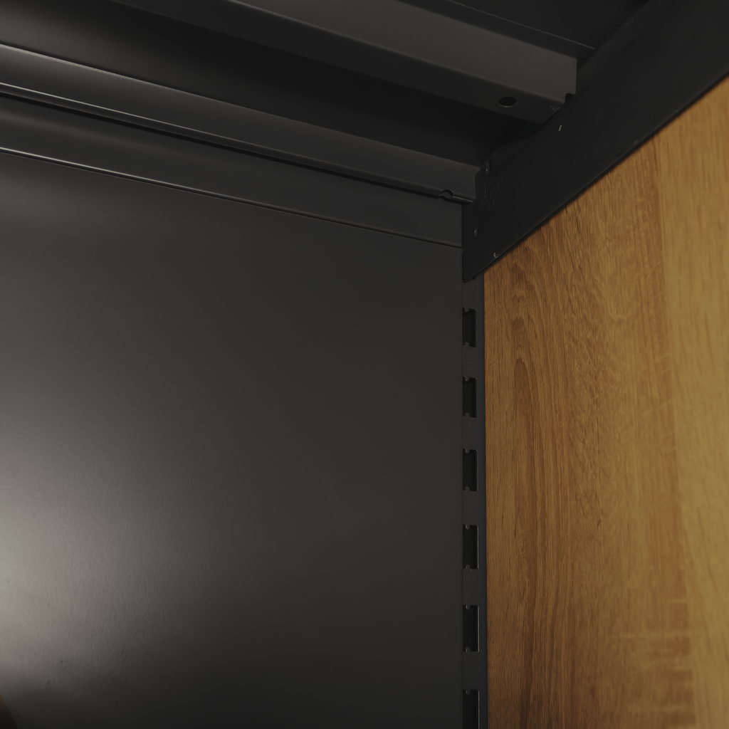 - Obudowa wykonana z wysokiej jakości płyty meblowej 18 mm, zapewnia odporność na zniszczenia.