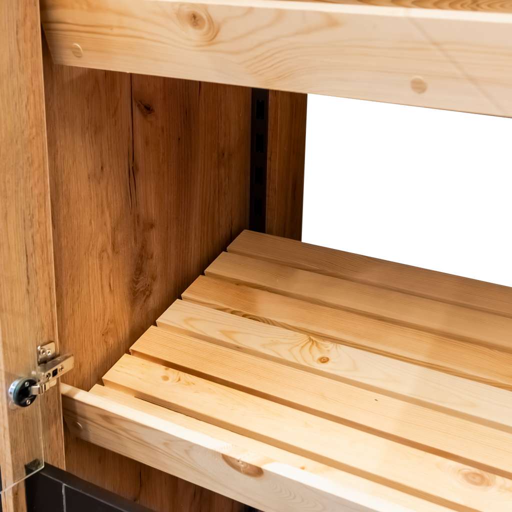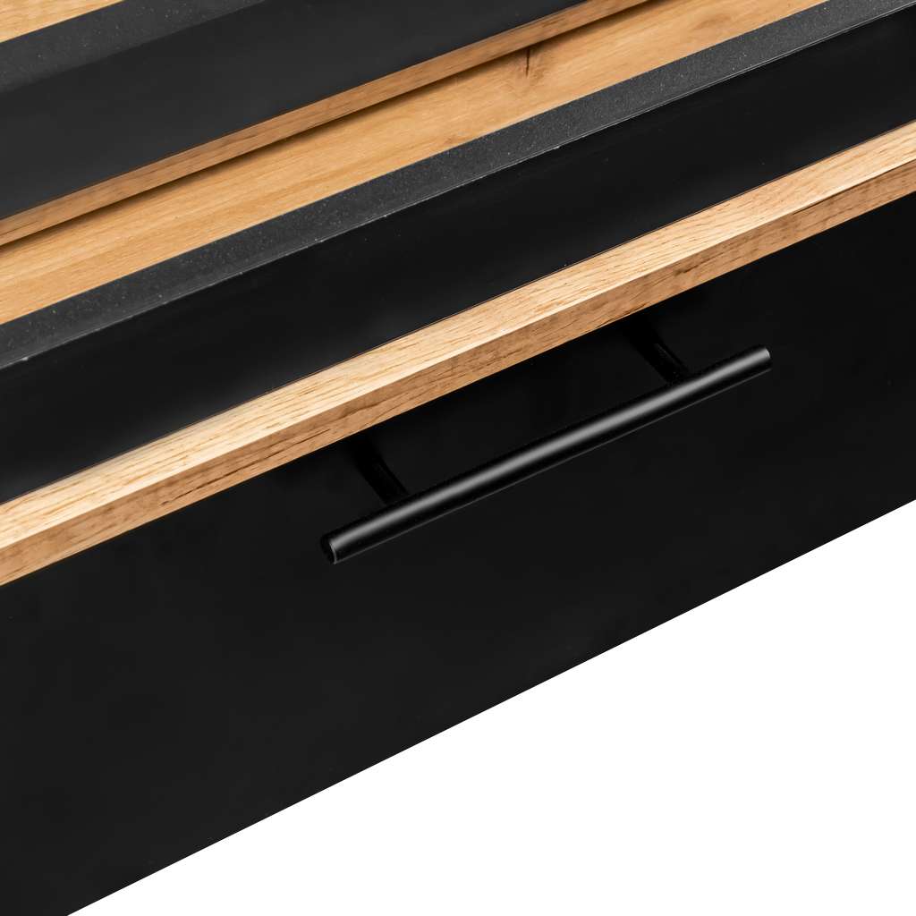 Nowoczesny regał na pieczywo Mega-M o wymiarach 136x62x204 cm to połączenie elegancji i funkcjonalności, które idealnie sprawdzi się w piekarniach, sklepach spożywczych oraz punktach gastronomicznych. Wykonany w modnym dekorze dąb kraft z kontrastującymi czarnymi akcentami, wyróżnia się estetycznym designem, który przyciąga wzrok i podnosi prestiż wnętrza. Przeszklone drzwi oraz podzielone na sekcje wnętrze umożliwiają atrakcyjną, uporządkowaną ekspozycję różnego rodzaju pieczywa, gwarantując jednocześnie jego higieniczne przechowywanie. Praktyczna, pojemna szuflada w dolnej części regału zapewnia dodatkowe miejsce na zapasy, worki lub akcesoria, ułatwiając codzienną pracę.