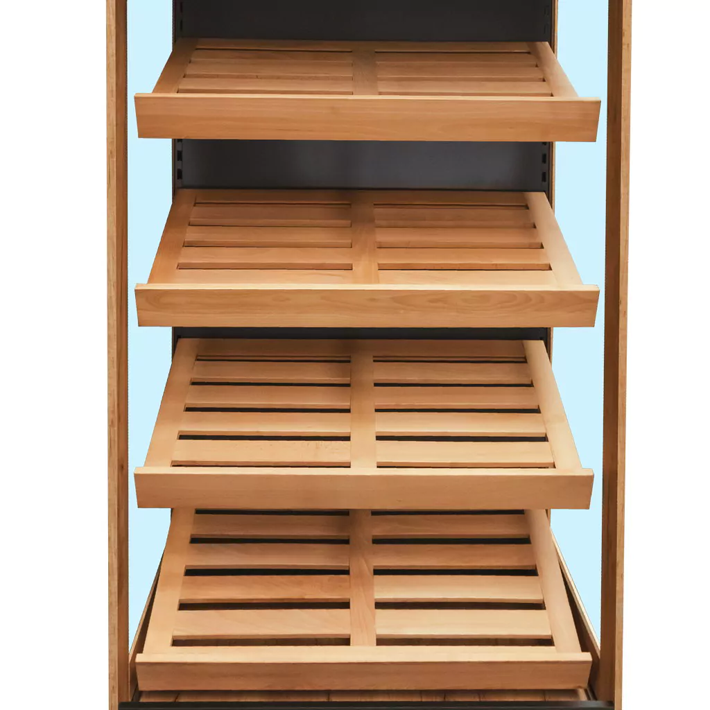 Regał piekarniczy marki Mega-M to wysokiej jakości mebel, który pozwala zwiększyć sprzedaż wypieków piekarniczych w sklepie czy piekarni. Służy do przechowywania oraz ekspozycji chlebów, bułek, bagietek, słodkich czy słonych przekąsek. Ze względu na połączenie tradycji i nowoczesności spełnia także funkcję dekoracyjną. Regał piekarniczy samoobsługowy wyróżnia się niezwykłą funkcjonalnością. Wyposażony jest w 4 pochylne półki, które umożliwiają klientom komfortowe wyciąganie pieczywa oraz półkę na okruchy ułatwiającą czyszczenie. Do efektywnej prezentacji bułek, chleba i wyrobów cukierniczych na regałach można dokupić drewniane skrzynki.