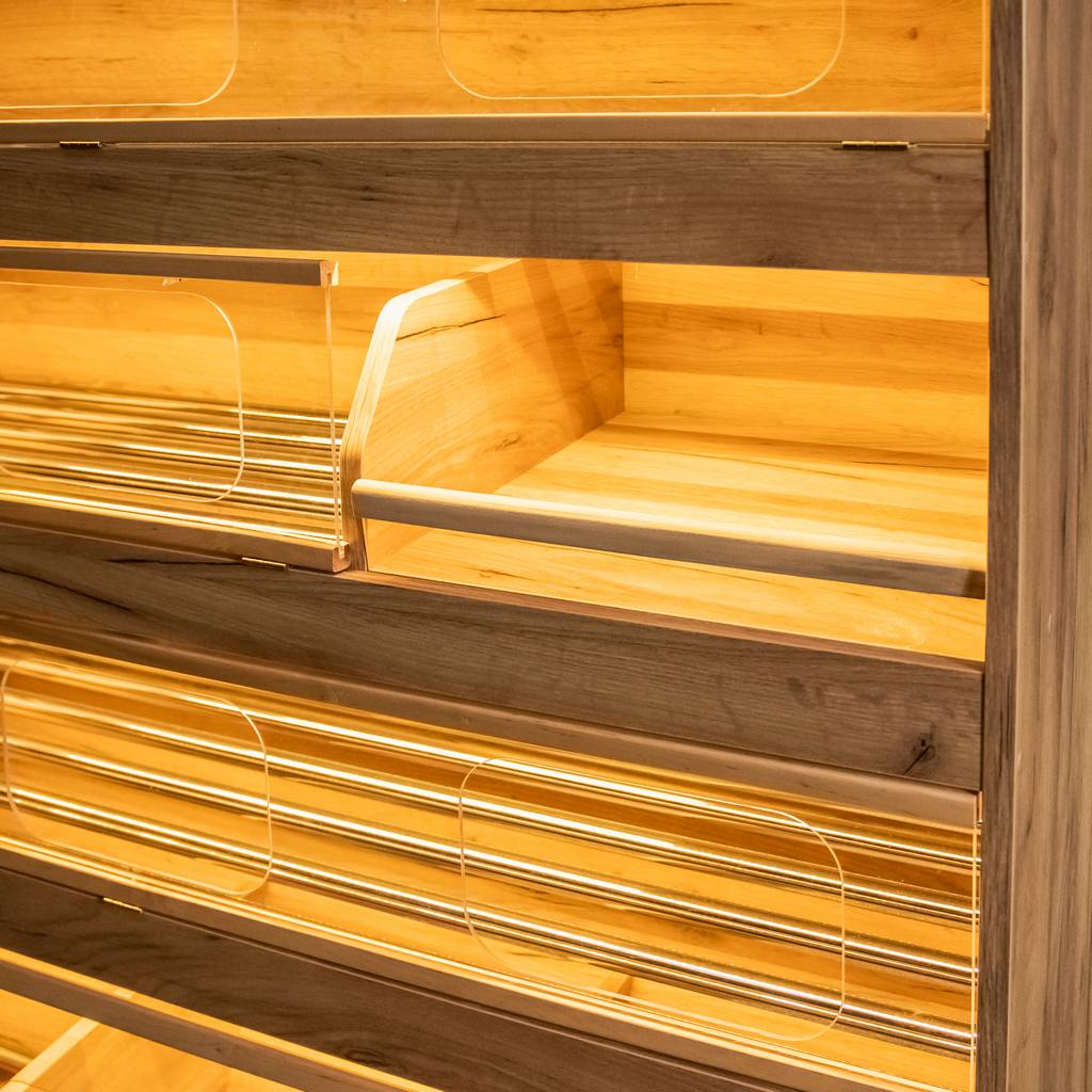 Regał na pieczywo H-180 cm L-125 cm G-60 cm plexi oświetlenie LED dąb kraft
