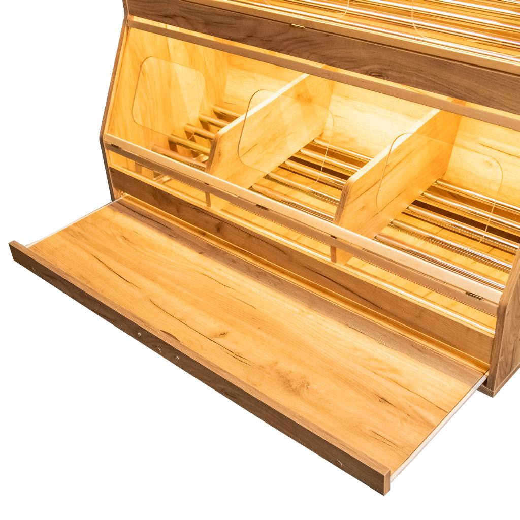 - Dolna półka z trzema przegrodami daje możliwość wyeksponowania wielu gatunków pieczywa.