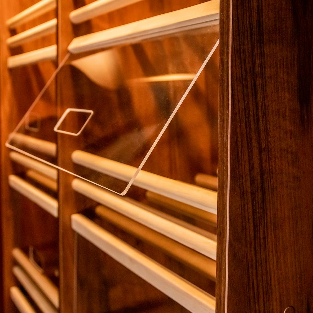 Regał na pieczywo z plexi, oświetleniem typu LED o wysokości 200 cm i szerokości 100 cm z szufladą na okruchy, 10 półkami, dwoma segmentami w kolorze orzech ecco.