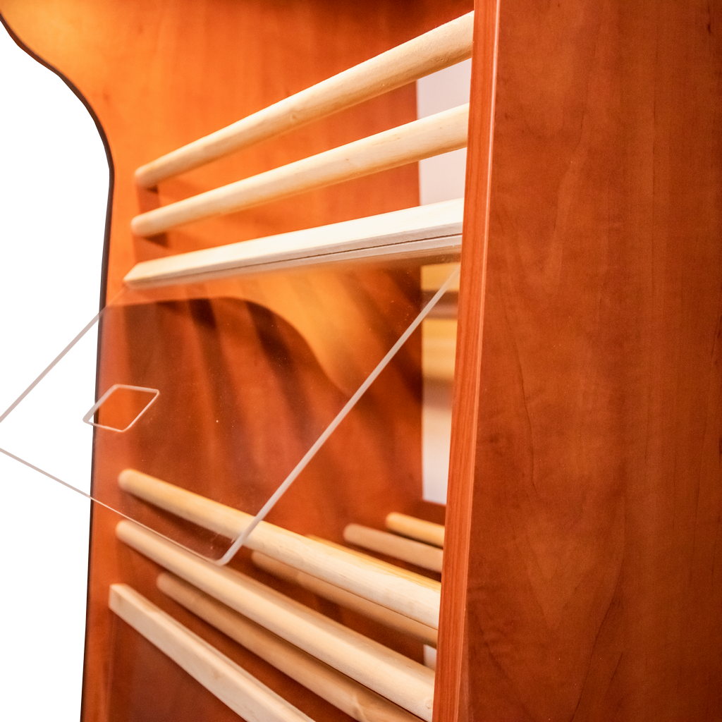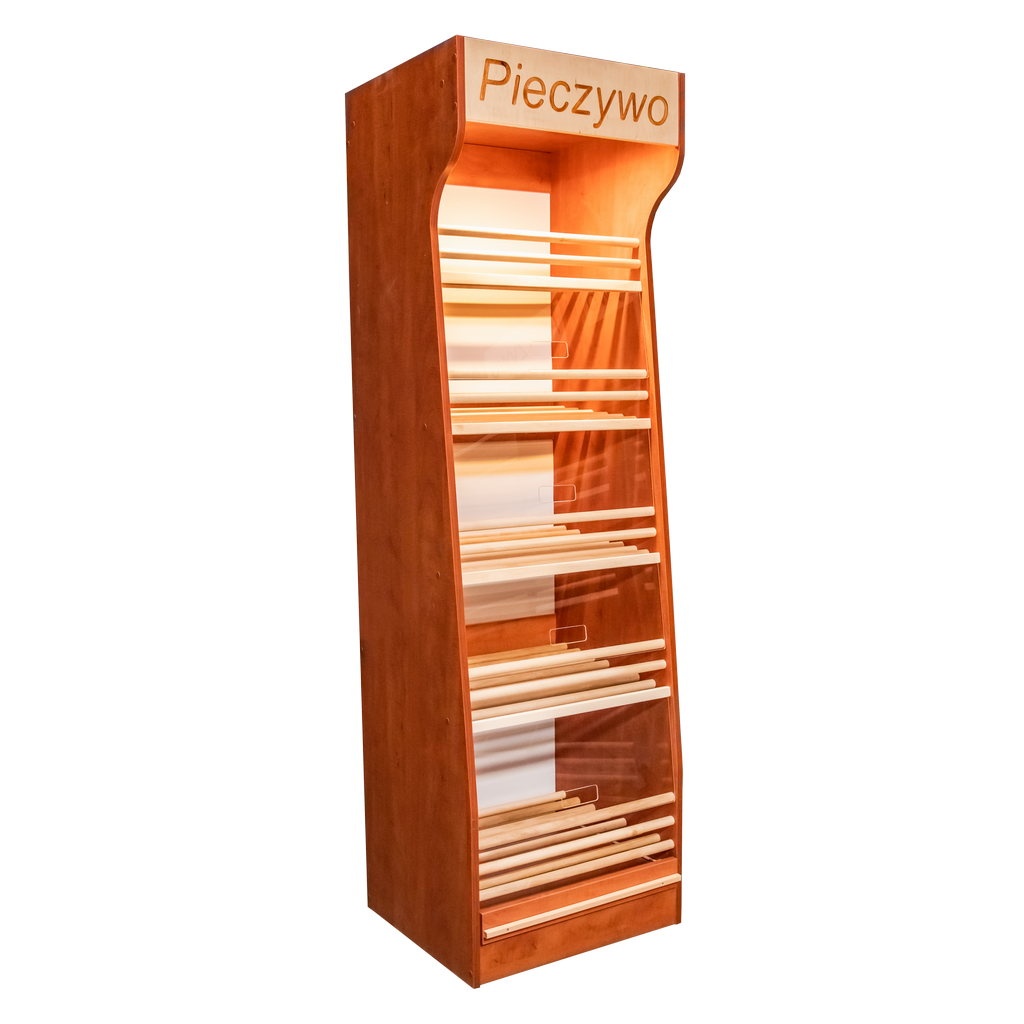 Wąskie regały piekarnicze idealnie sprawdzą się w małych sklepach umożliwiając prezentację pieczywa oraz łatwy dostęp do produktu. Wyposażenie w żarówkę LED podkreśla walory oferowanego pieczywa. Półki z plexi ustawione pod kątem gwarantują, że towar będzie idealnie wyeksponowany a pieczywo zachowa świeżość na dłużej. Wysuwana szuflada na okruchy zapewnia łatwość utrzymania czystości. Solidne wykonanie z naturalnego drewna sprawia, że regały idealnie sprawdzą się zarówno w małych jak i średnich placówkach handlowych. Regał na chleb ma na samej górze regału posiada toper z napisem „pieczywo”. Jest to przydatny napis, który informuje klienta, gdzie znajduje się pieczywo.