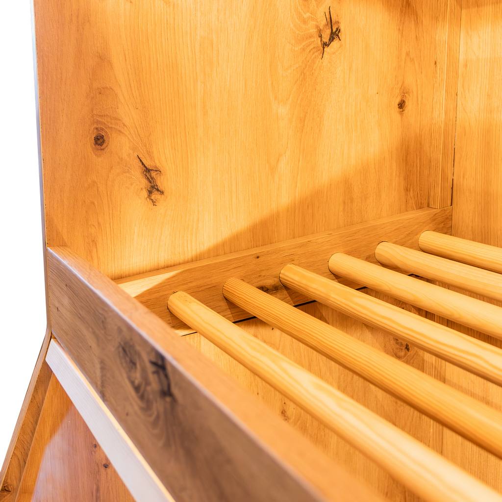 Regał na pieczywo z plexi, o wysokości 205 cm i szerokości 100 cm z półkami ustawionymi pod kątem, oraz szufladą na okruchy w kolorze dąb artisan. Półki posiadają szczeliny, dzięki którym okruchy spadają na sam dół regału do specjalnej szuflady na okruchy. Rozwiązanie to pozwala na zachowanie czystości oraz ułatwiają sprzątanie mebla. Regał posiada osłonę plexi, która sprawi, że przechowywane pieczywo dłużej zostanie świeże. Dodatkowym atutem jest oświetlenie LED, zapewniające dobrą widoczność i lepszą ekspozycję towaru. Regał na pieczywo świetnie sprawdzi się do eksponowania wyrobów piekarniczych. Dzięki solidnemu wykonaniu mebel sklepowy posłuży długie lata.