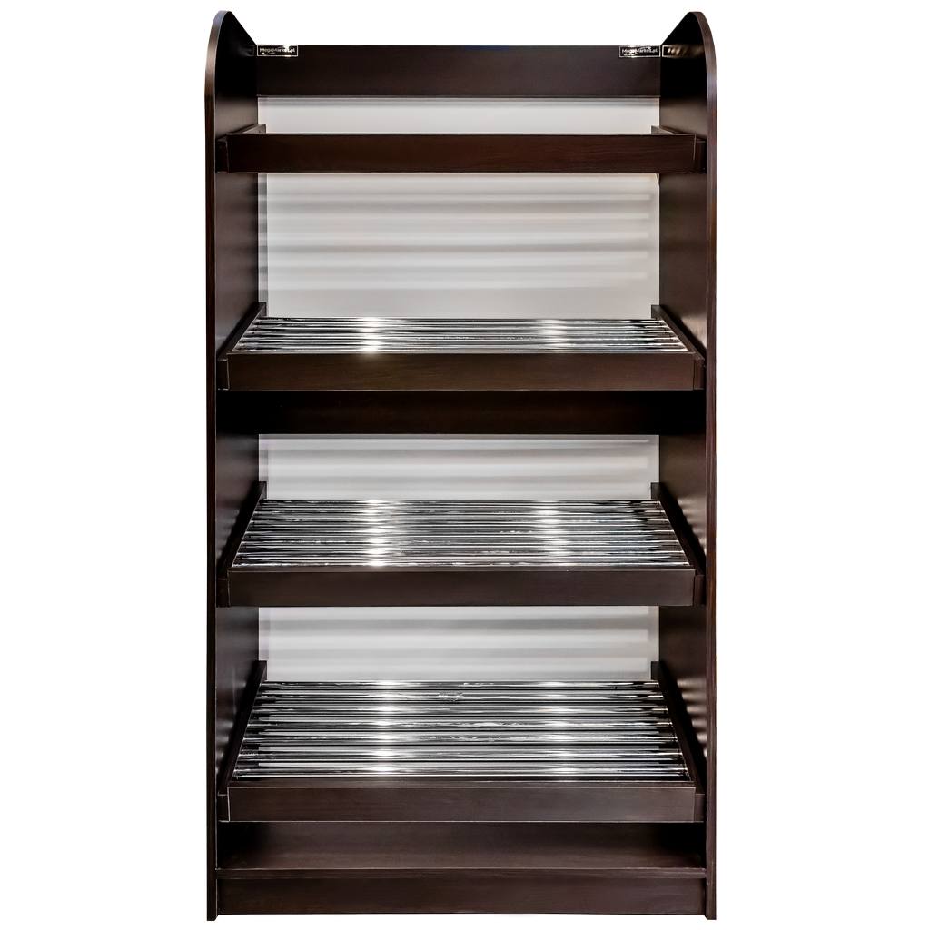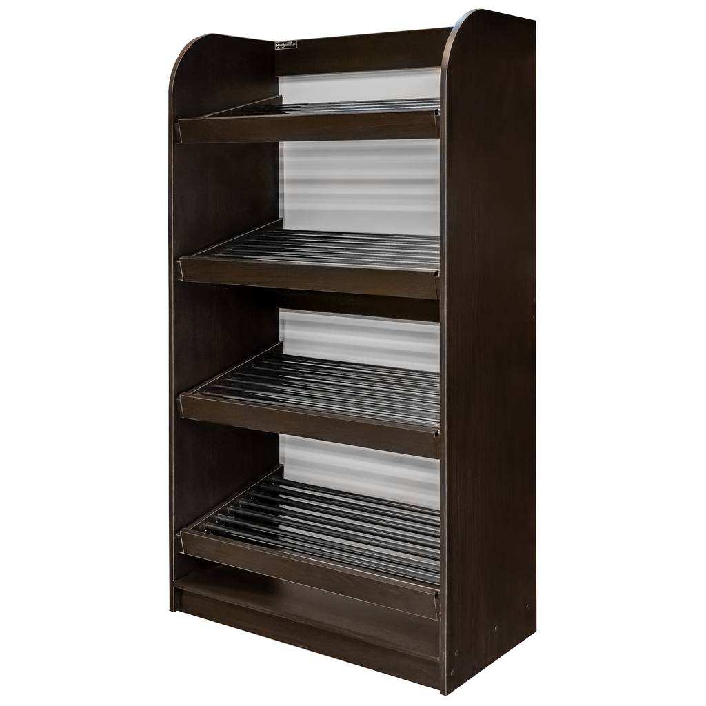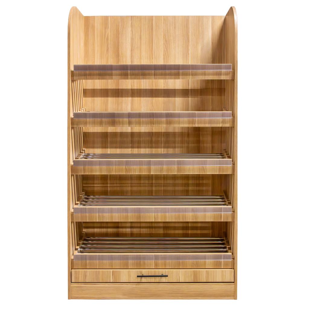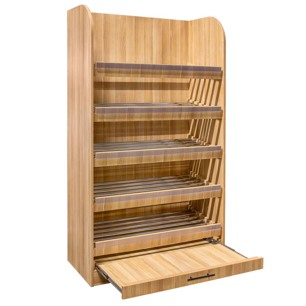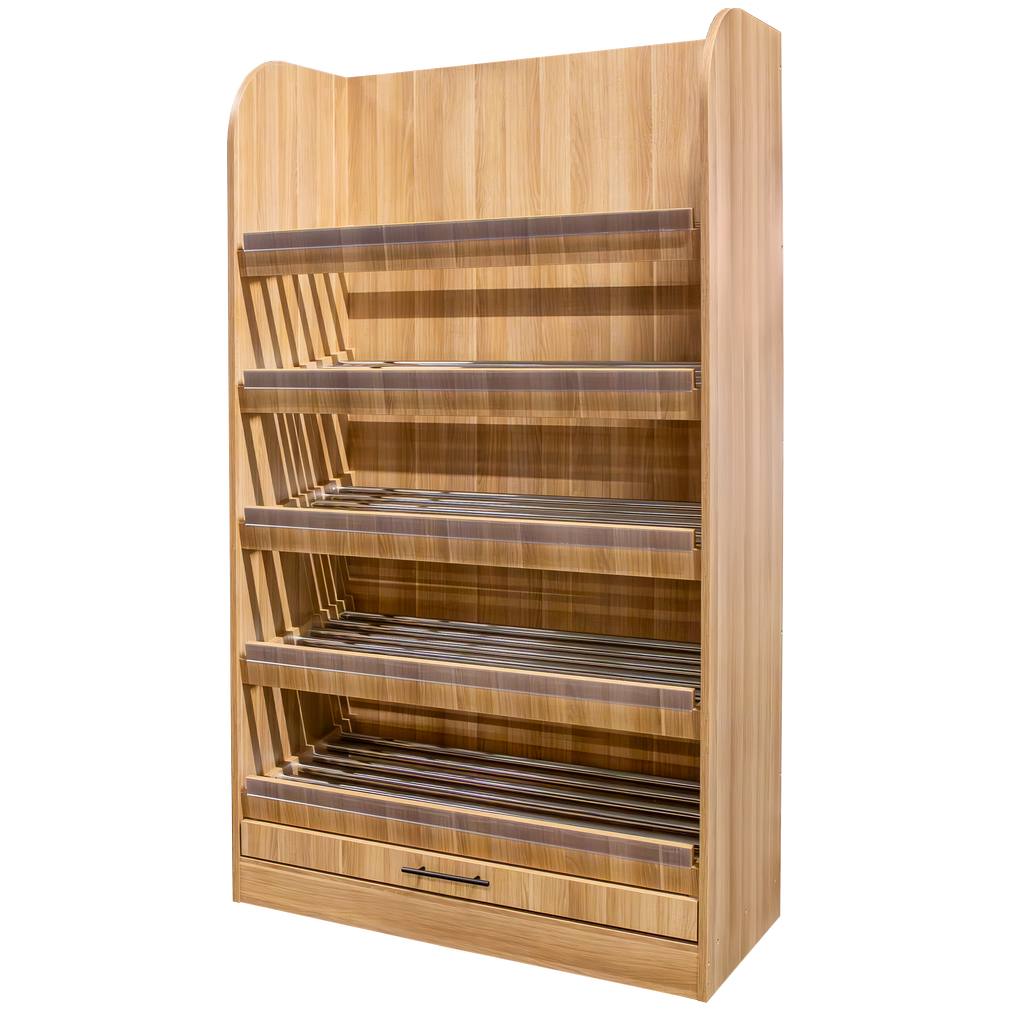 Regał na warzywa i owoce Mega-M to wysokiej jakości mebel sklepowy. Ze względu na swoją estetykę ułatwia właściwą prezentację warzyw. A to wpływa na odczucia klientów i zwiększenie sprzedaży. Regał samoobsługowy posiada 5 półek z metalowymi szczebelkami ustawionych pod delikatnym kątem, co zapewnia lepszą widoczność oraz szufladę na okruchy. Regał warzywny Mega-M jest niezwykle funkcjonalny i umożliwia komfortowe użytkowanie.