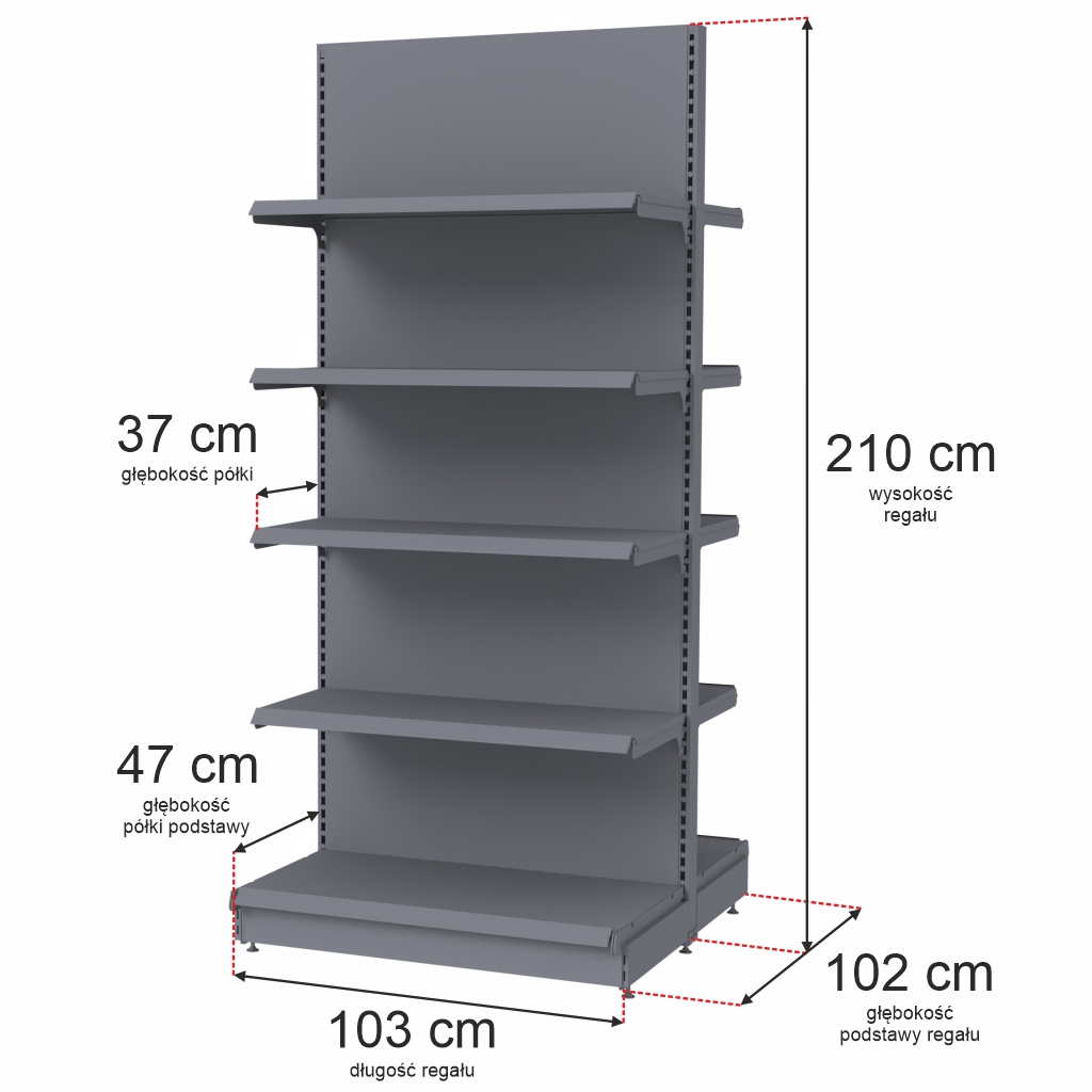 Regał sklepowy gondola Mega-M Merkury to trwała metalowa konstrukcja zapewniająca stabilność i wysoki udźwig towarów. Regał sklepowy gondola o wysokości 210 cm i szerokości 103 cm. Podstawa regału ma 47 cm a głębokość półek wiszących wynosi 37 cm. Model w kolorze grafitowym doskonale pasuje do każdego wnętrza sklepu.