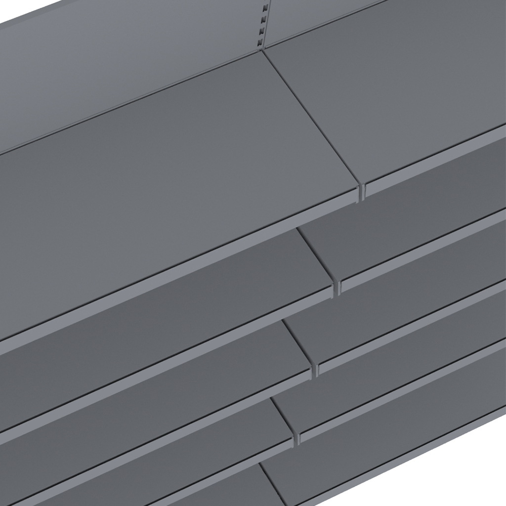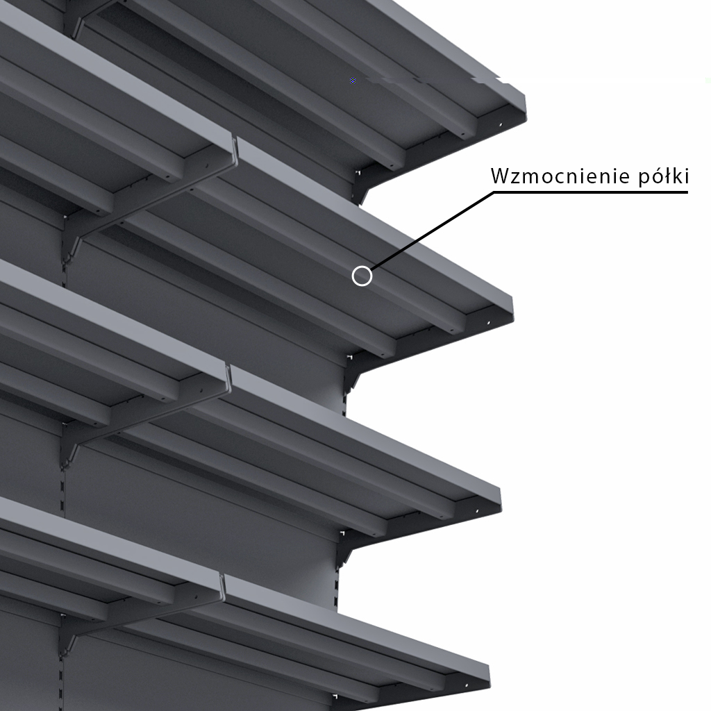 - Możliwość tworzenia ciągu regałowego dowolnej długości. Pozwala na przemyślane zagospodarowanie przestrzeni sklepowej.