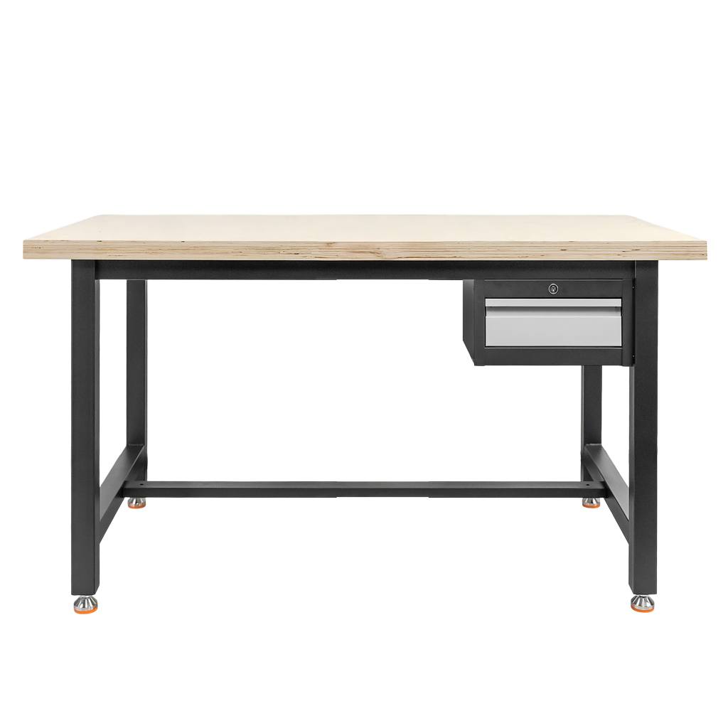 Uniwersalny stół warsztatowy Mega-M o długości blatu roboczego 150 cm z podwieszaną szafką z szufladą zamykaną na klucz. To rozwiązanie dla profesjonalistów i pasjonatów majsterkowania, którzy cenią sobie trwałość i ergonomię. Model ten oferuje optymalną przestrzeń roboczą oraz praktyczne schowki na narzędzia, dzięki czemu organizacja pracy staje się łatwa i komfortowa. Stalowa, malowana proszkowo konstrukcja stołu, zapewnia dużą stabilność i odporność na intensywną eksploatację. Wytrzymały idealny do różnych zadań blat roboczy wykonany jest z płyty wiórowej oraz sklejki.