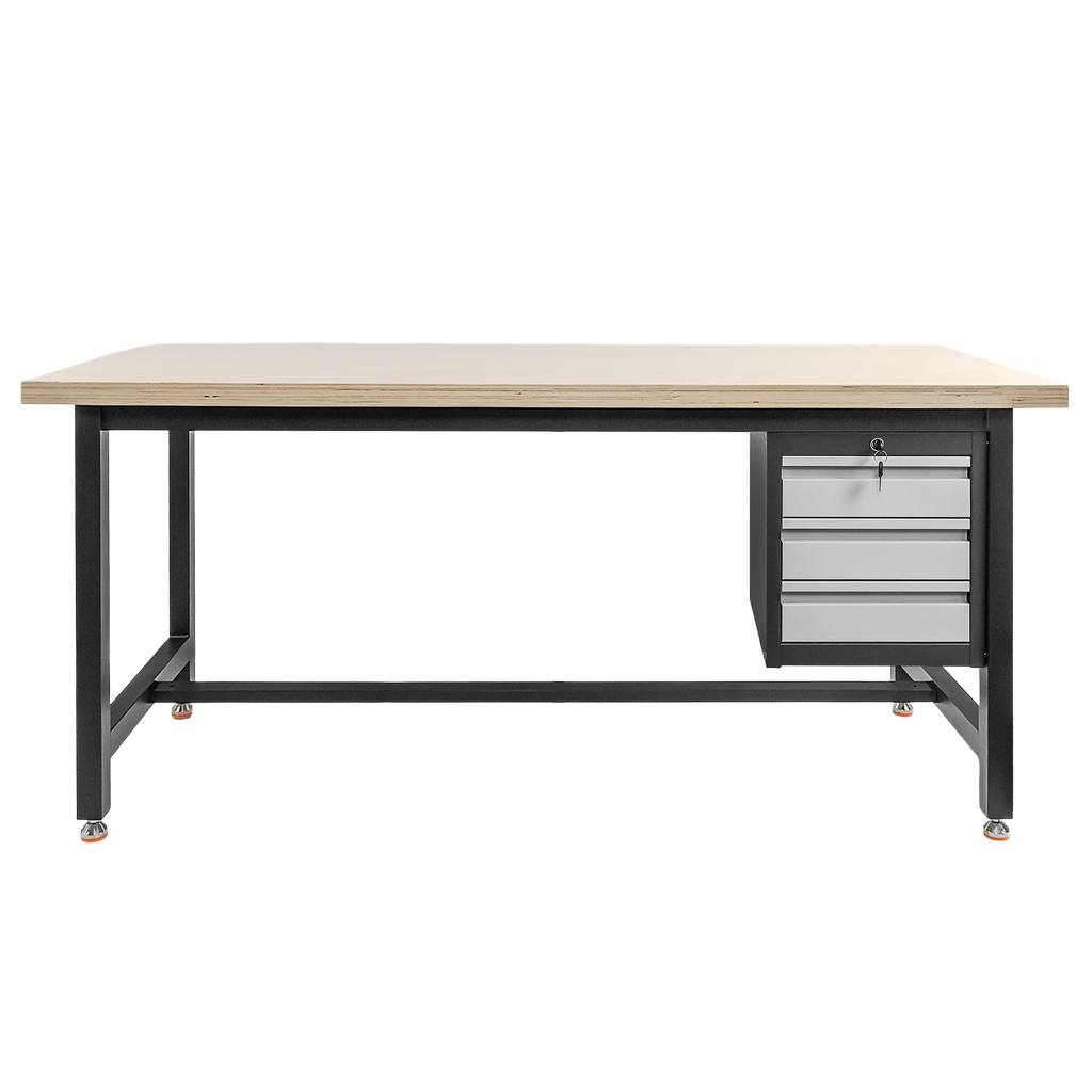 Stół warsztatowy Mega-M S-180 cm to propozycja dla osób potrzebujących zarówno dużej powierzchni roboczej, jak i funkcjonalnej przestrzeni do przechowywania. Trzy szuflady na zamek centralny pozwalają utrzymać pełen porządek w narzędziach nawet podczas intensywnej pracy. Solidny blat roboczy wykonany z płyty wiórowej oraz sklejki sprawiają, że mebel jest idealny do różnych zadaniach warsztatowych. Jego metalowa konstrukcja malowana proszkowo umożliwia intensywne użytkowanie przez wiele lat. Stół roboczy to doskonały wybór do warsztatów, garaży, serwisów, zakładów produkcyjnych, gdzie niezbędny jest duży blat roboczy do pracy i majsterkowania.