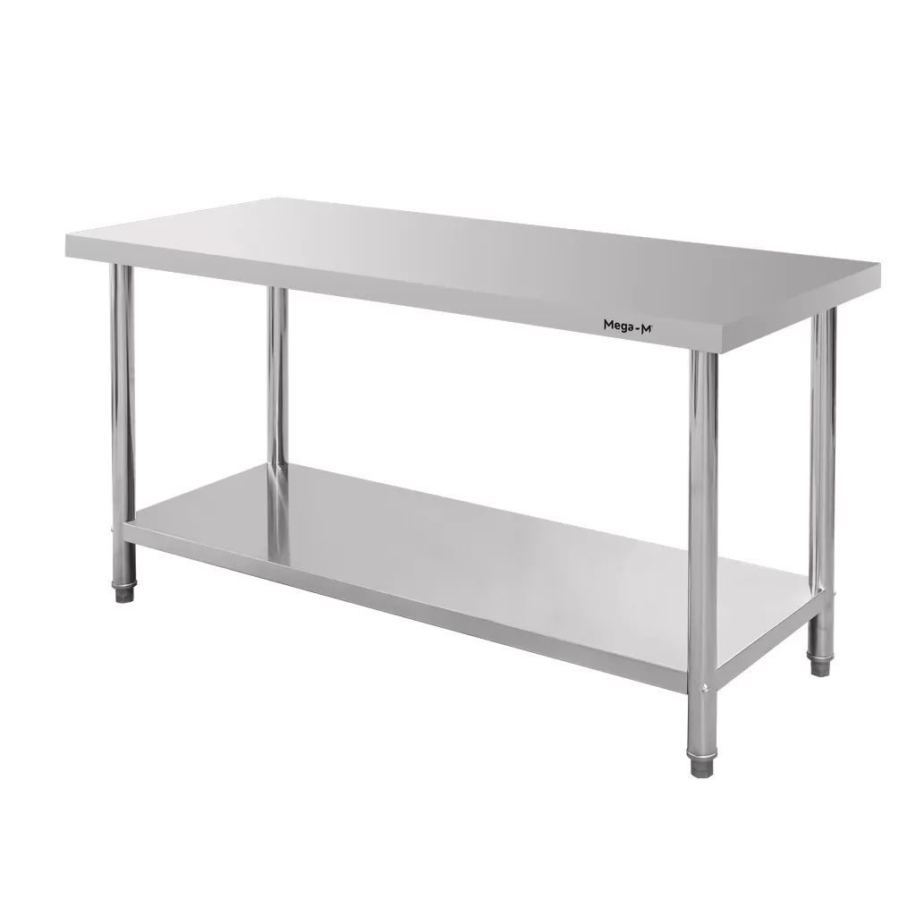 Centralny dwupoziomowy stół gastronomiczny 160x60x85 cm został wykonany ze stali nierdzewnej o grubości 0,6 mm, która jest odporna na wszelkiego rodzaju uszkodzenia mechaniczne i korozję oraz biologicznie obojętna (nie wchodzi w reakcję z żywnością). Stół gastronomiczny Mega-M STANDARD został wyposażony w dolną półkę, która stanowi cenną w każdej kuchni dodatkową powierzchnię przechowywania oraz regulowane nóżki, za pomocą których można zniwelować nierówności podłoża i stworzyć stabilne stanowisko pracy. Dzięki swojej gładkiej powierzchni mebel jest łatwy do utrzymania w czystości.