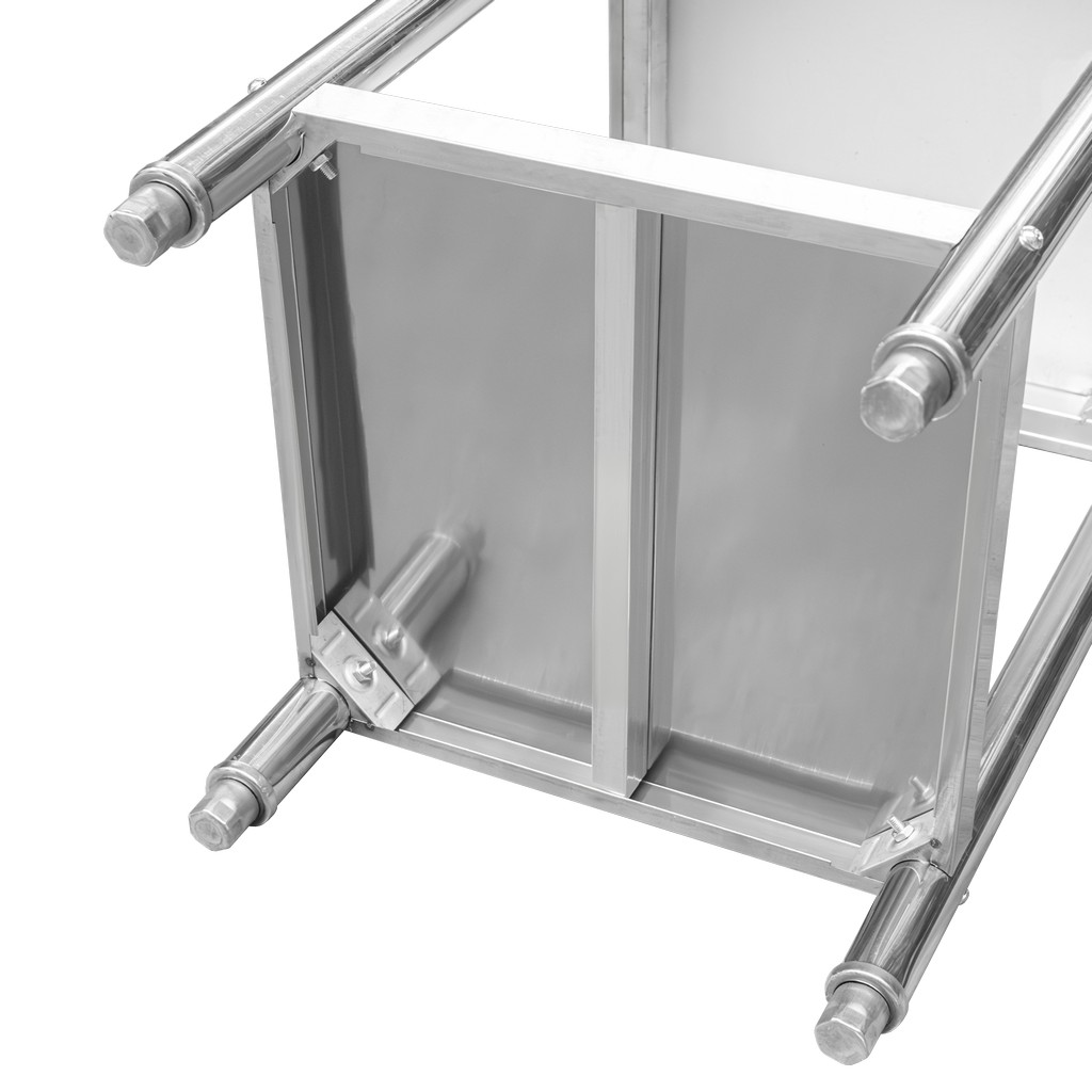 Centralny dwupoziomowy stół gastronomiczny został wykonany ze stali nierdzewnej o grubości 0,6 mm, która jest odporna na korozję i intensywne użytkowanie oraz nie wchodzi w reakcję z żywnością. Stół gastronomiczny Mega-M STANDARD został wyposażony w dolną półkę, która stanowi cenną w każdej kuchni dodatkową powierzchnię przechowywania oraz regulowane nóżki, za pomocą których można zniwelować nierówności podłoża. Dzięki swojej gładkiej powierzchni mebel jest łatwy do utrzymania w czystości.
