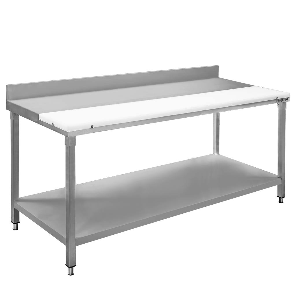 Stół masarski roboczy 2-poziomowy jest wykonany z wysokiej jakości stali nierdzewnej odpornej na wszelkiego rodzaju uszkodzenia mechaniczne oraz korozję. Odczepiana płyta polietylenowa daje możliwość krojenia i przygotowywania posiłków bezpośrednio na stole. Dolna półka pozwala na przechowywanie przydatnych naczyń i urządzeń. Stół posiada rant, który umożliwia zabezpieczenie ściany za stołem przed zabrudzeniami.