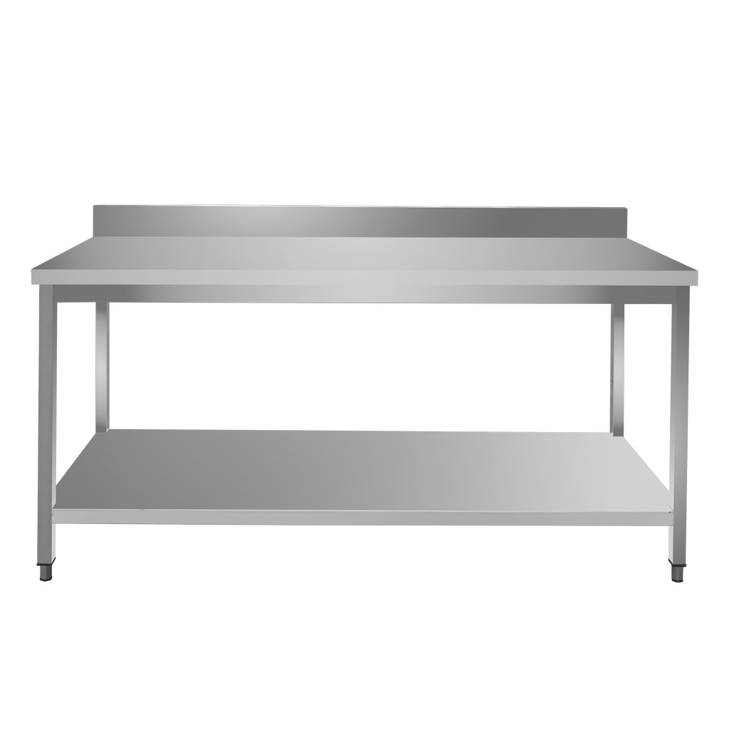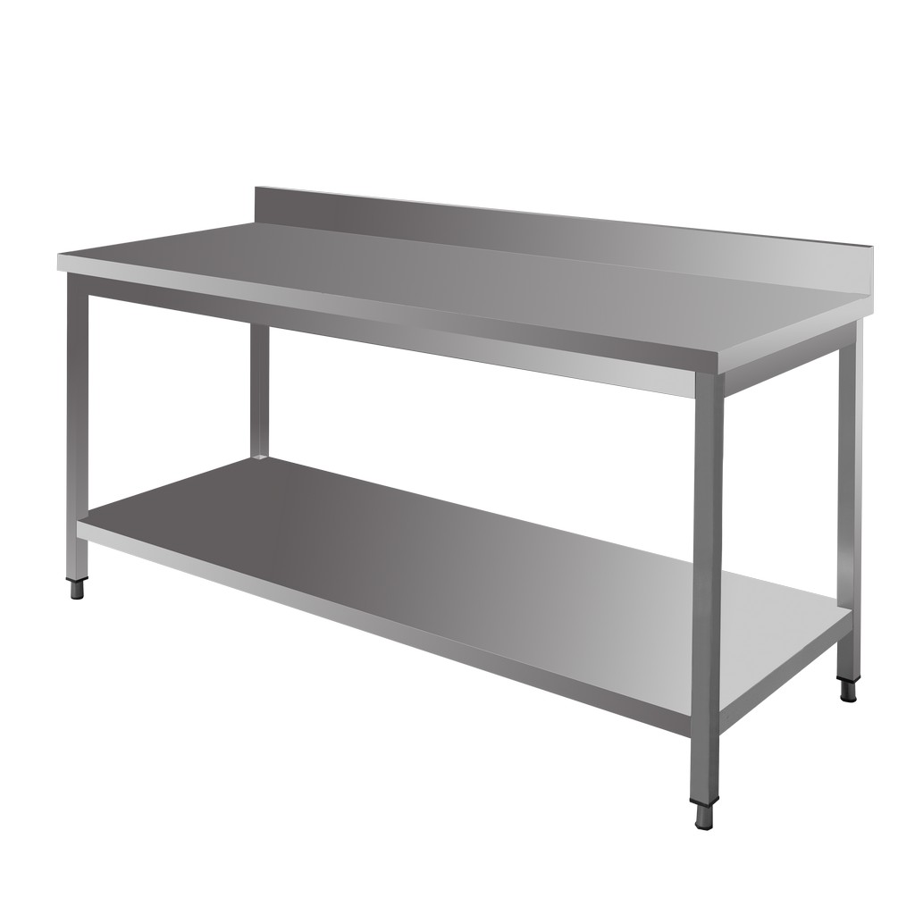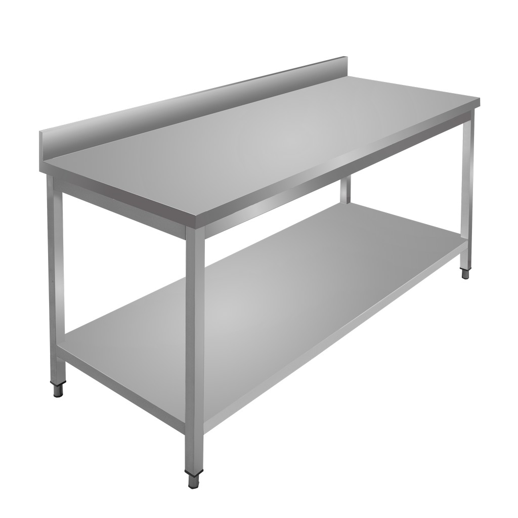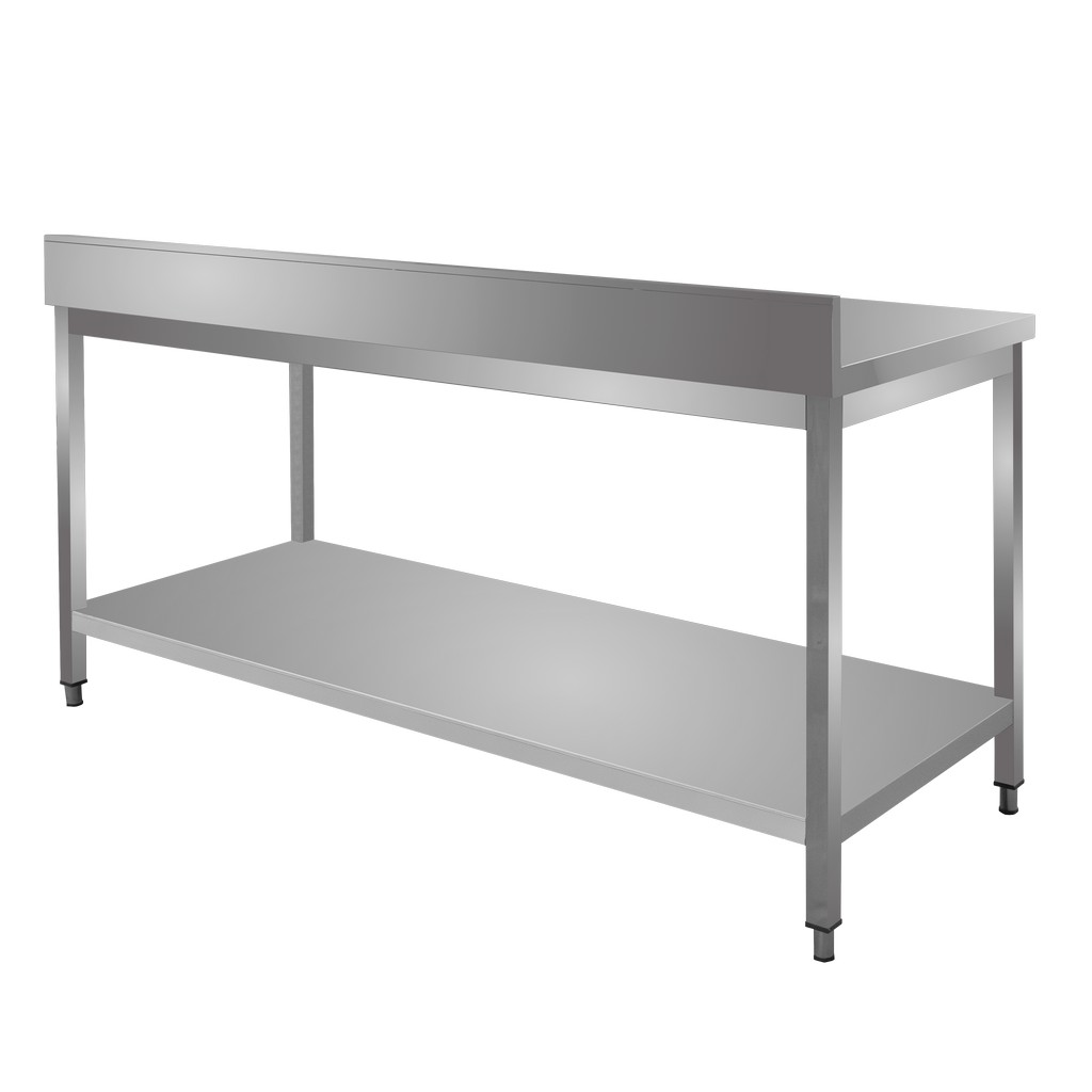 Stół gastronomiczny przyścienny z półką i rantem marki Mega-M o wymiarach 180x70x85 cm to mebel bardzo wytrzymały, funkcjonalny, a dodatkowo bezpieczny w kontakcie z żywnością. Mebel gastronomiczny wykonany został ze stali nierdzewnej odpornej na korozję i intensywne użytkowanie. Nierdzewny stół roboczy posiada dwupoziomową konstrukcję, która umożliwia przechowywanie potrzebnych sprzętów gastronomicznych. Dodatkowym atutem w stole przyściennym jest rant, który zapewnia ochronę ściany przed zachlapaniem. Stół gastronomiczny to idealny mebel dla osób dbających o higienę i bezpieczeństwo podczas gotowania.