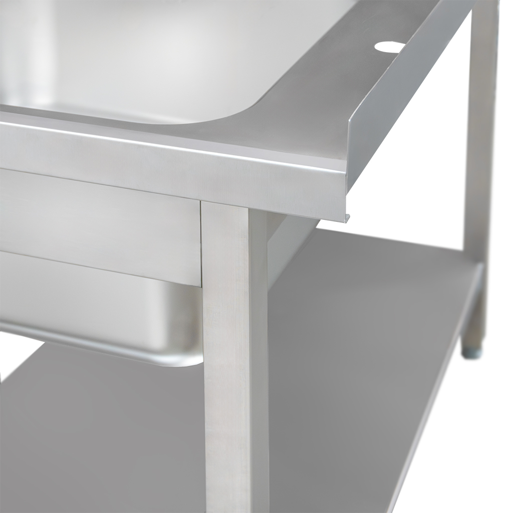 Przyścienny zlew gastronomiczny z komora po prawej stronie i półką Mega-M 100x70x85 cm to mebel spawany z wysokiej jakości stali nierdzewnej odpornej na intensywną eksploatację, korozję czy też działanie niskich i wysokich temperatur. Wzmocniony zlew gastronomiczny posiada dwupoziomową konstrukcję pozwalającą na umieszczenie w jego dolnej części naczyń potrzebnych do pracy w każdej kuchni. Mebel został wyposażony w praktyczną komorę zlewu, rant oraz regulowane nóżki.