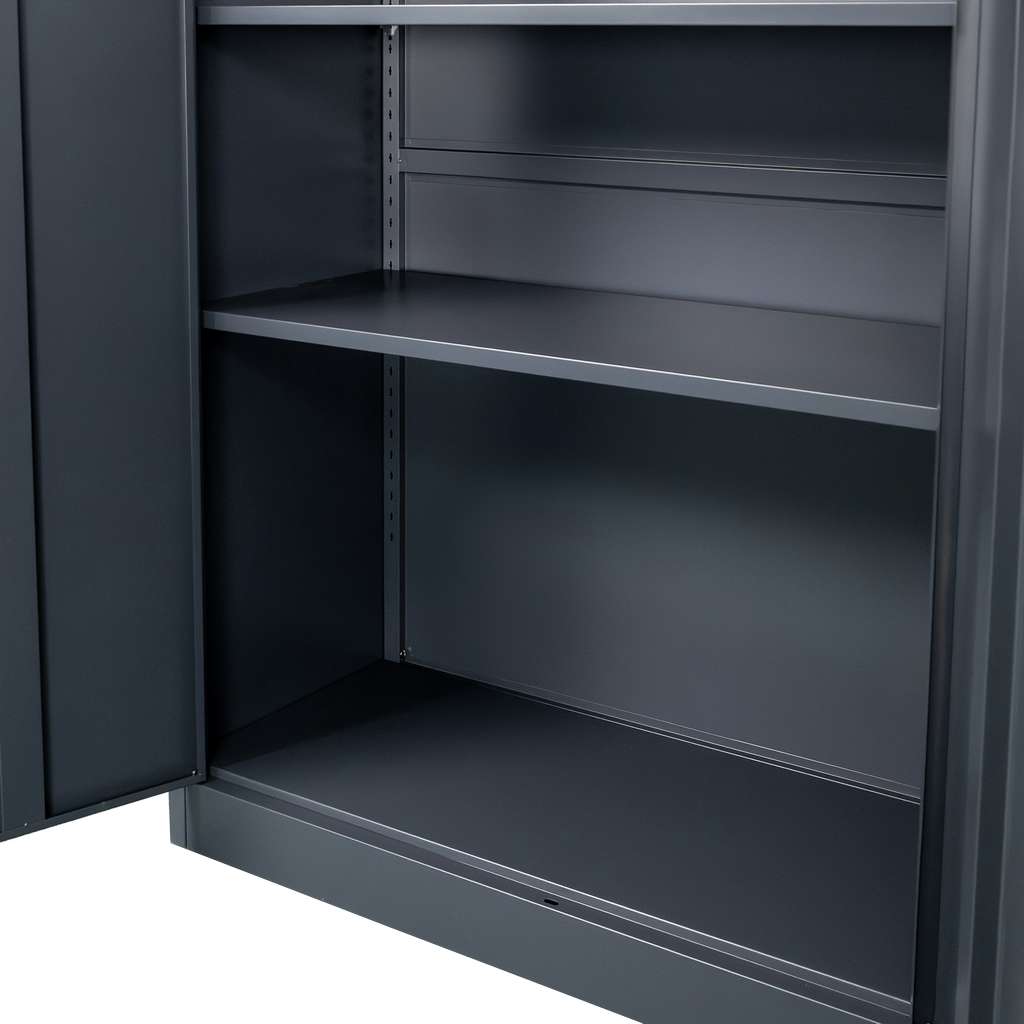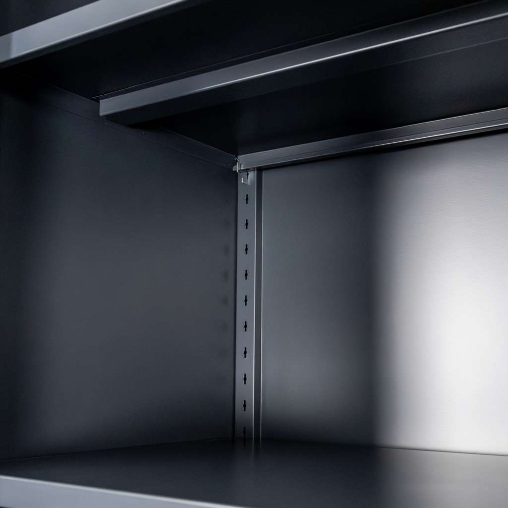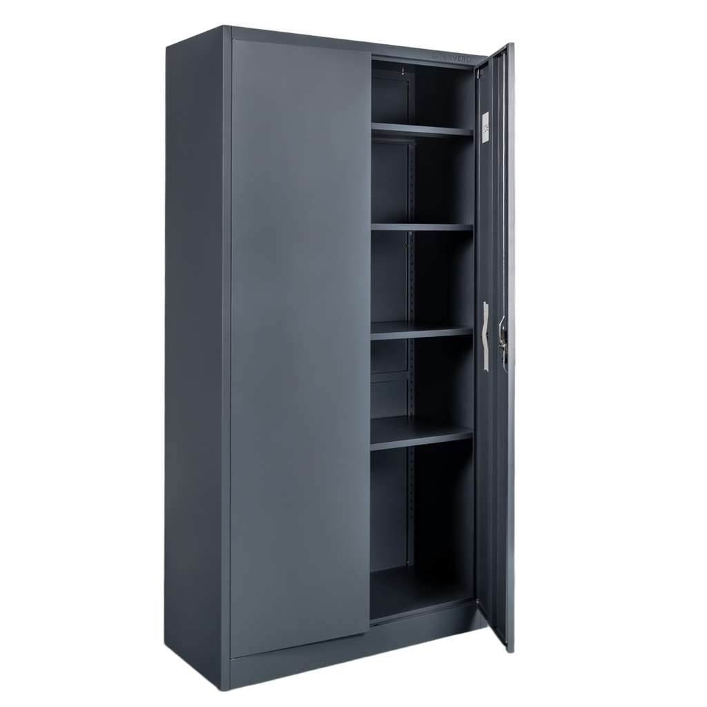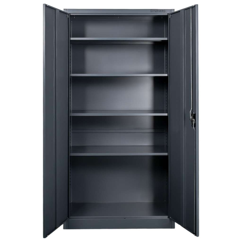 Metalowa szafa biurowa FURVERO w kolorze grafitowym to idealne rozwiązanie dla osób, które szukają mebla łączącego nowoczesny design z funkcjonalnością. Wykonana z wysokiej jakości blachy stalowej malowanej proszkowo, charakteryzuje się odpornością na korozję i intensywne użytkowanie. Model o wymiarach 90x40x185 cm wyposażony został w pełne dwuskrzydłowe drzwi z zamkiem trzypunktowym, który skutecznie zabezpiecza dokumenty przed dostępem osób niepowołanych. Wnętrze szafy kryje cztery solidne, regulowane półki, dzięki czemu łatwo dopasujesz przestrzeń do formatu i ilości akt.