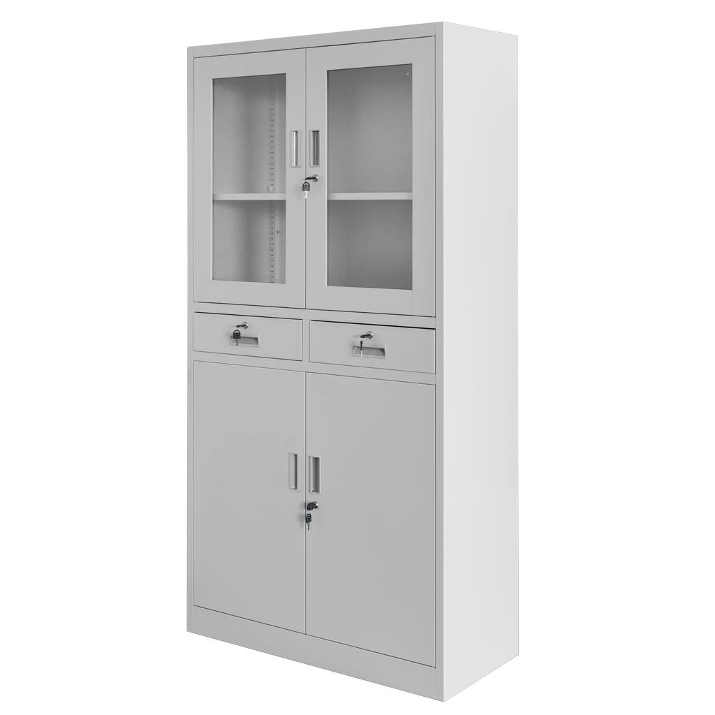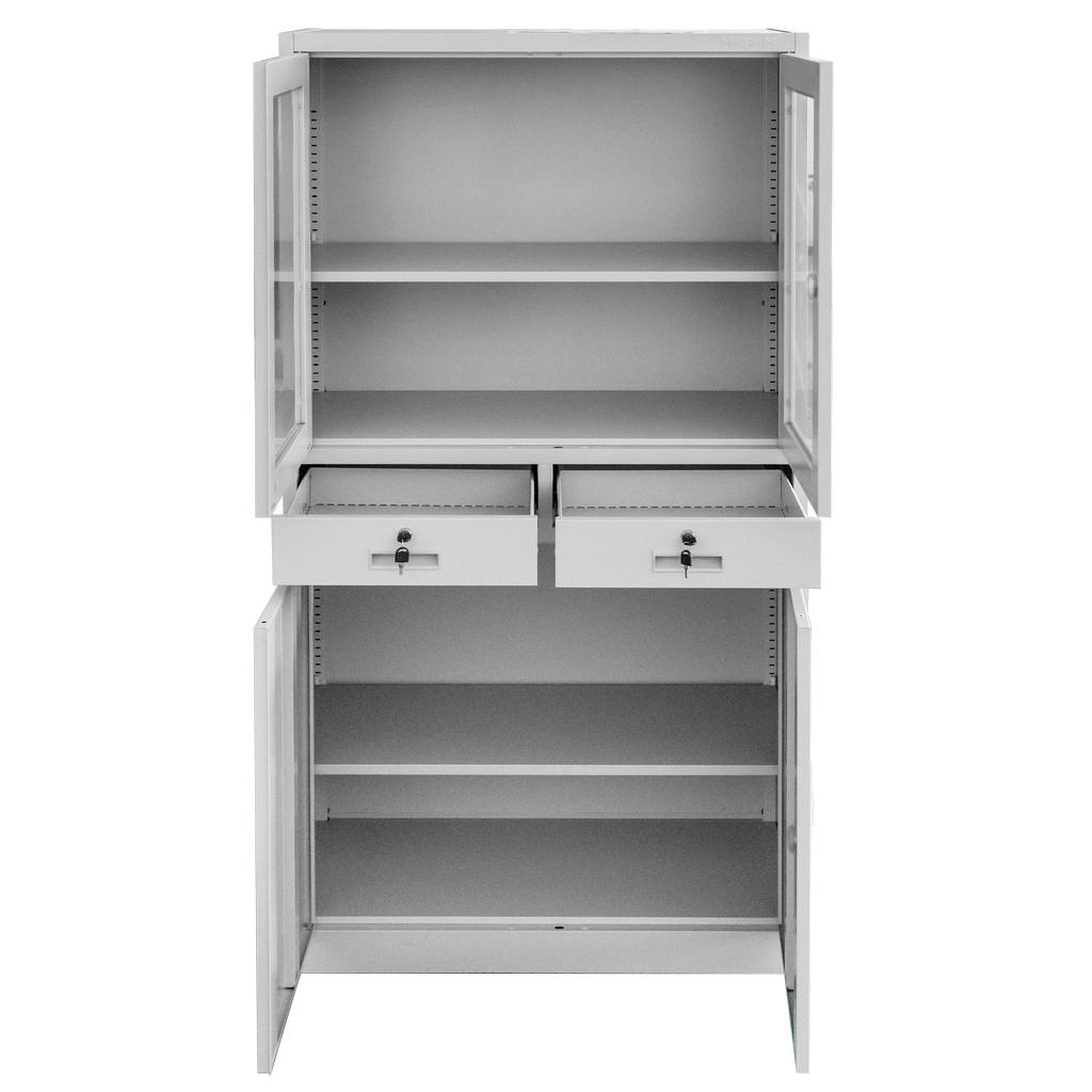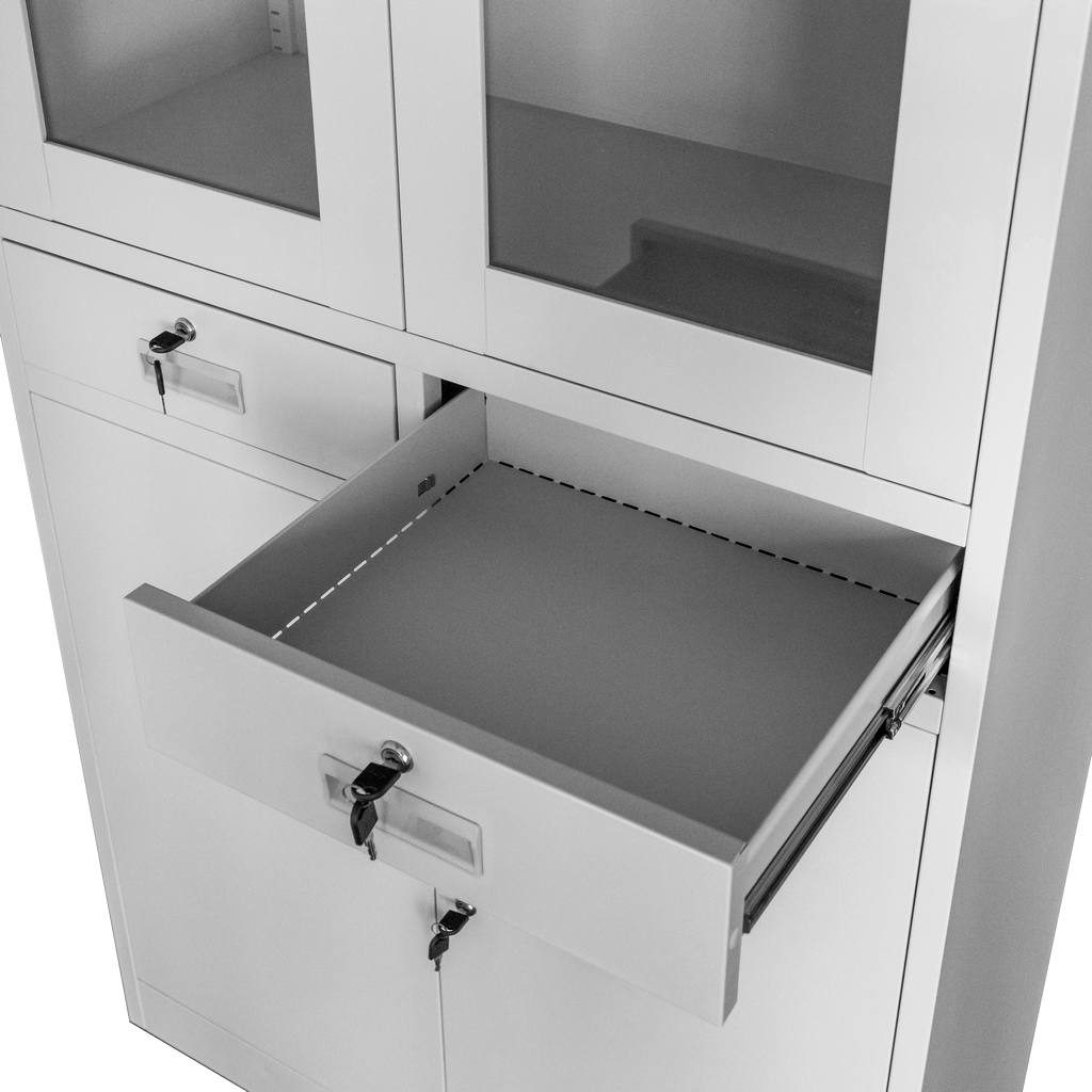 Szafa biurowa metalowa Mega-M WENUS W-01 na dokumenty przeszklona z szufladami szara S- 90 cm G- 40 cm H-185 cm skręcana N