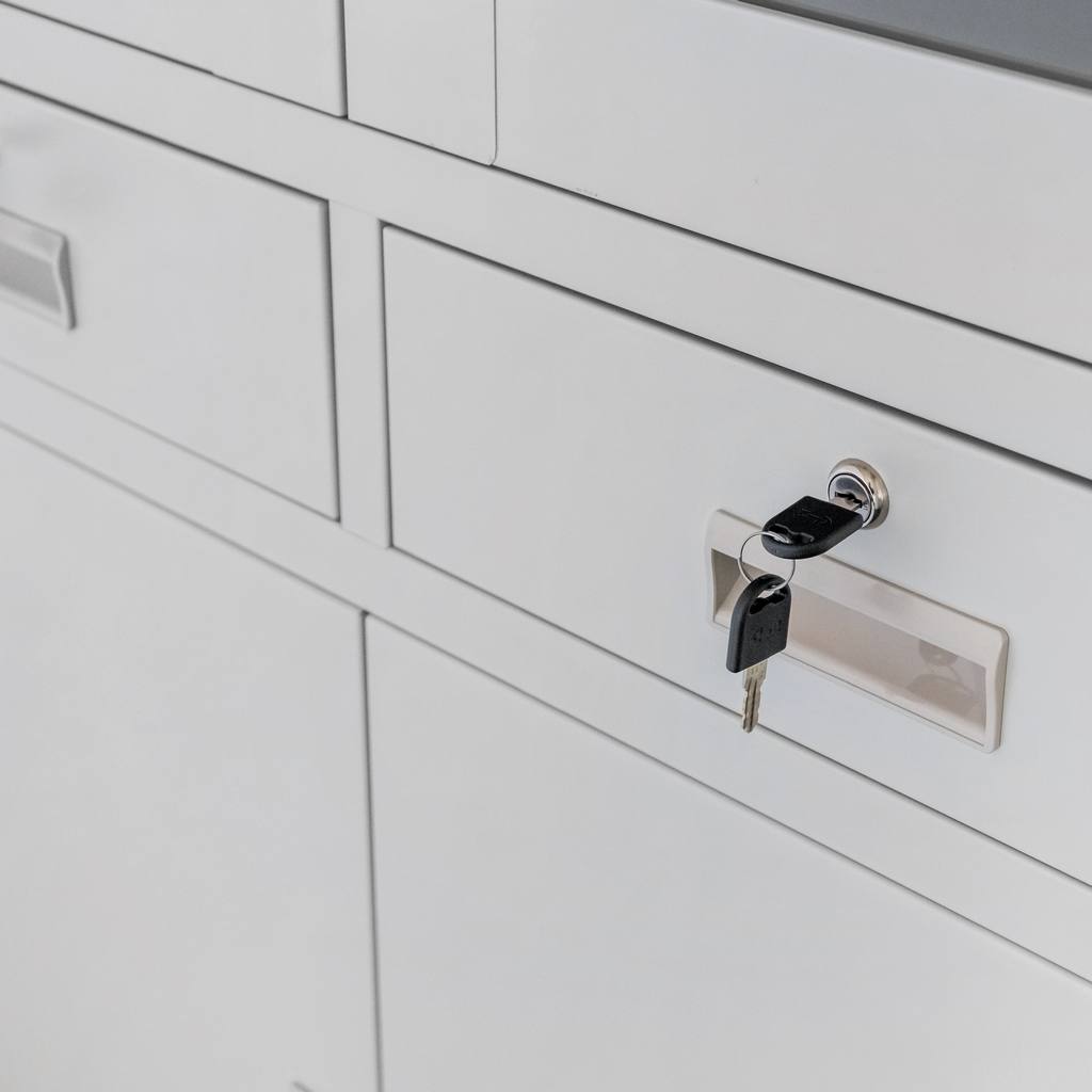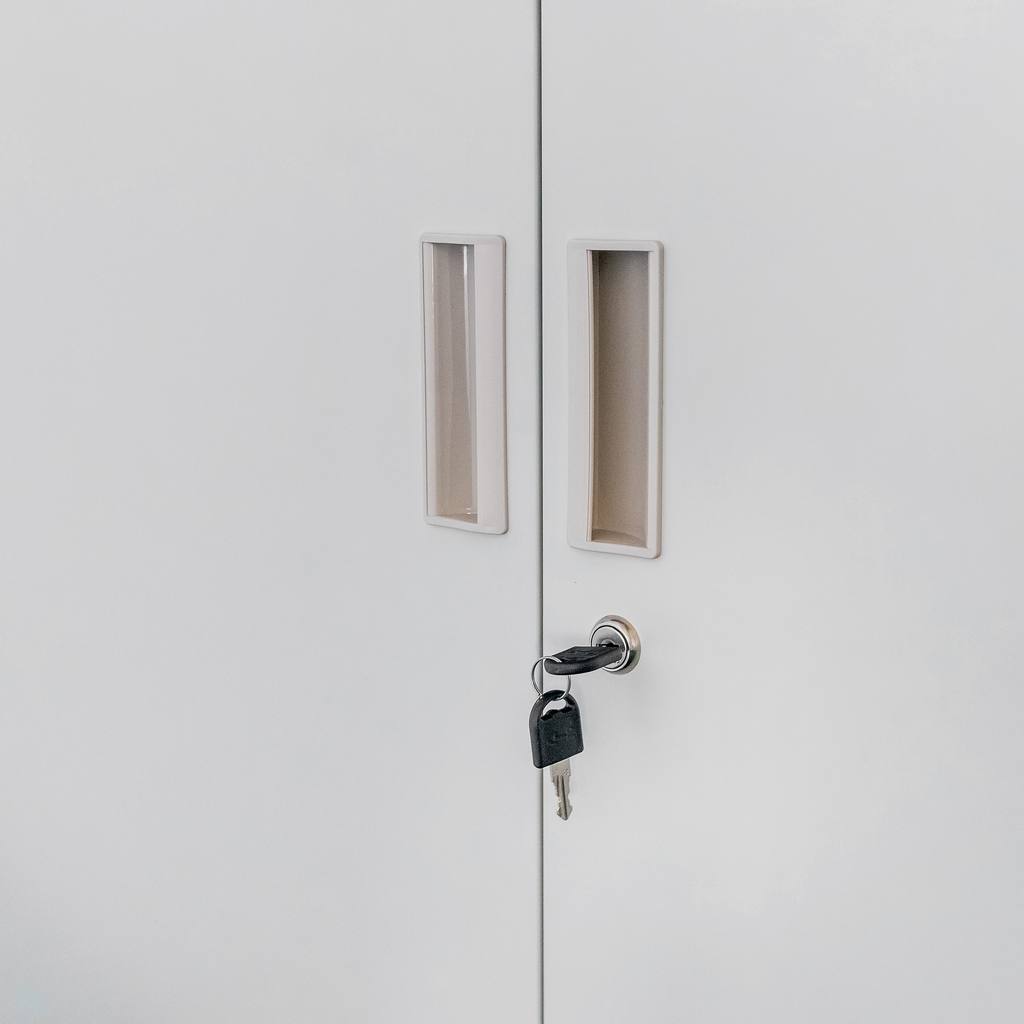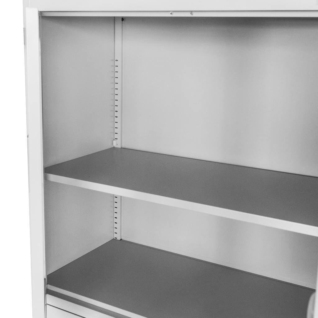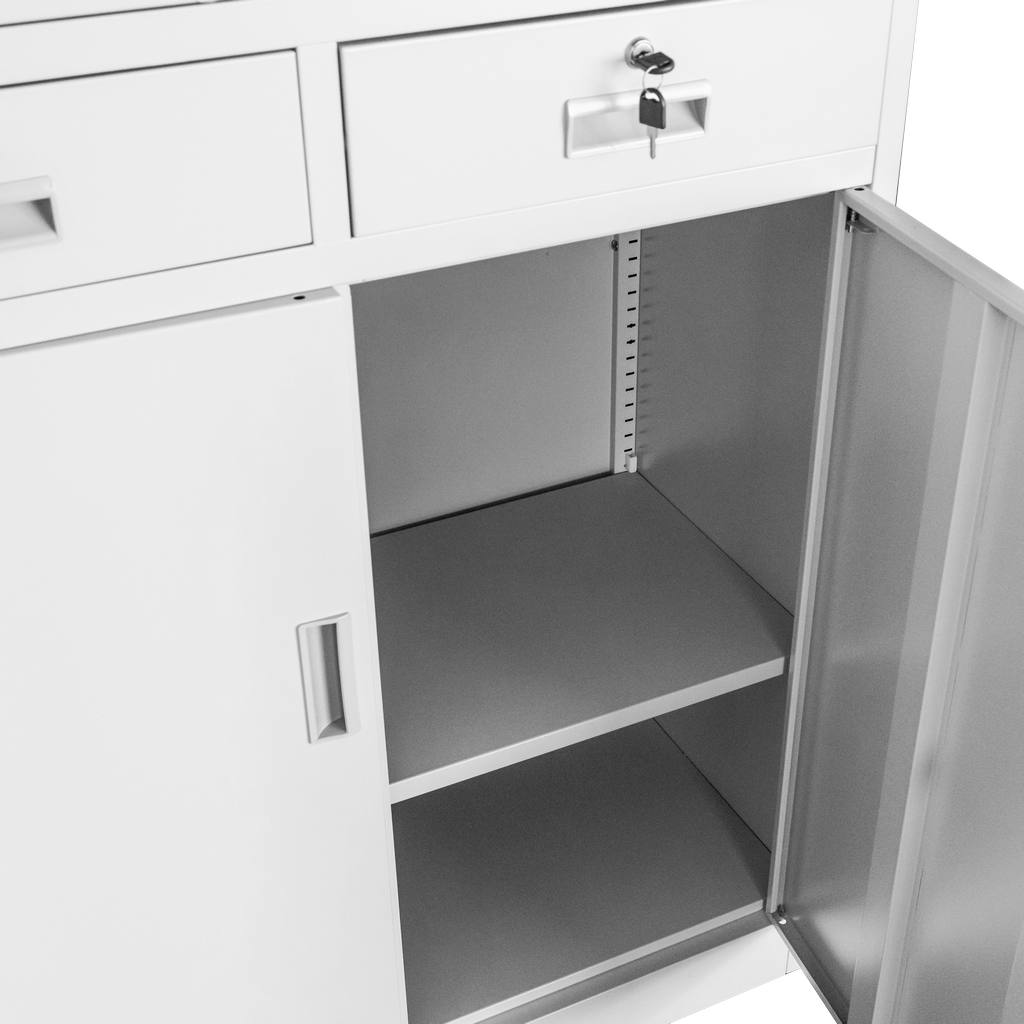 Szafa biurowa metalowa marki Mega-M zapewnia komfortowy dostęp i bezpieczeństwo przechowywania dokumentacji biurowej. Solidna i wytrzymała konstrukcja wykonana z blachy stalowej malowanej proszkowo jest odporna na korozję. Szafa na dokumenty posiada przeszkloną witrynę, szafkę z pełnymi drzwiami oraz dwie wygodne szuflady. Dzięki zastosowaniu zamka zabezpieczającego w każdym z elementów, bez przeszkód można przechowywać ważne akta bez dostępu osób trzecich. Szafa biurowa posiada regulowane półki, dzięki czemu z łatwością można dostosować wysokość do wielkości segregatorów.