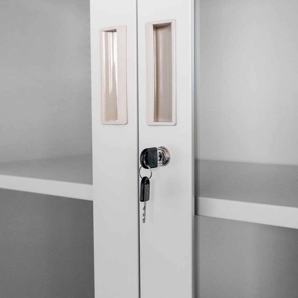 Biurowa szafa metalowa z przeszklonymi drzwiami Mega-M WENUS – do gabinetu, laboratorium, przychodni